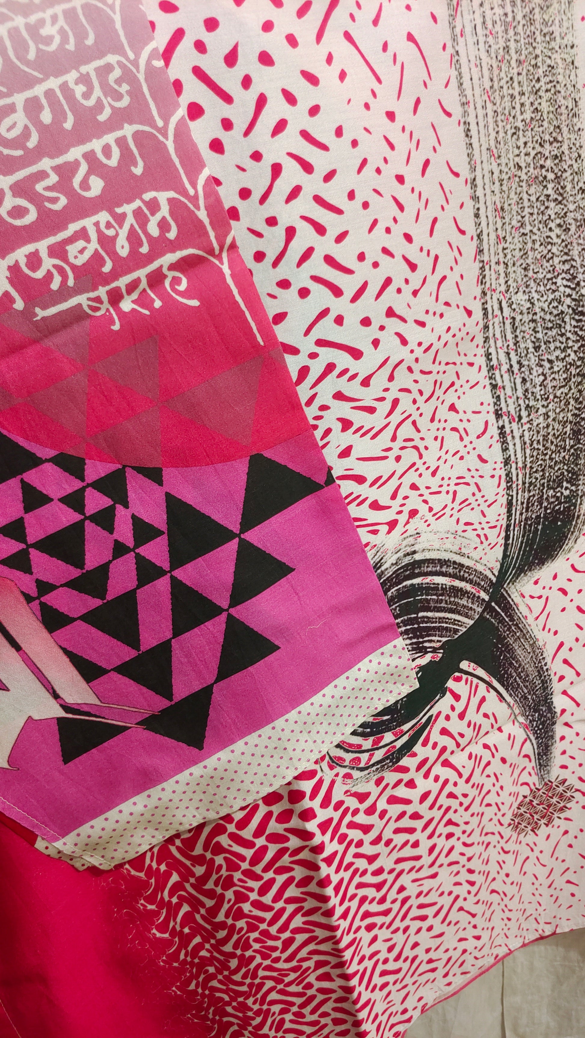 A loose straight-cut midcalf-length kurta with wide three-quarter sleeves, silky fabric, gradient red to deep pink color with cream panels, large black calligraphic symbol on the front, bold sacred geometric patterns and script motifs on the sleeves, cream side panels with small polka dots,
