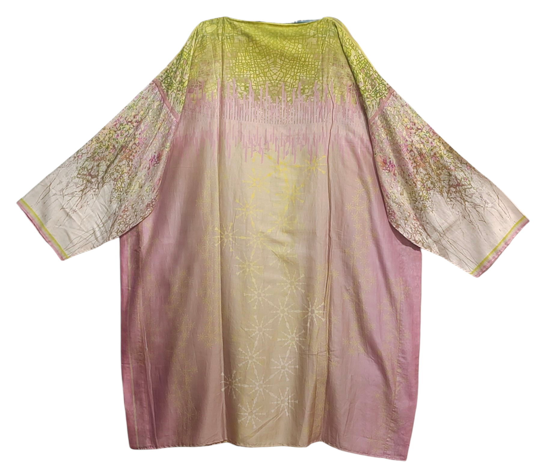 This kurta features an elegant digital printed chanderi designed in unique abstract floral theme.kurta is 48 inch maximum in length but can be shortened as per requirement as there is no neckline .The single side ghera is 34 inch so sizes upto 5XL are possible to get tailored in this material.