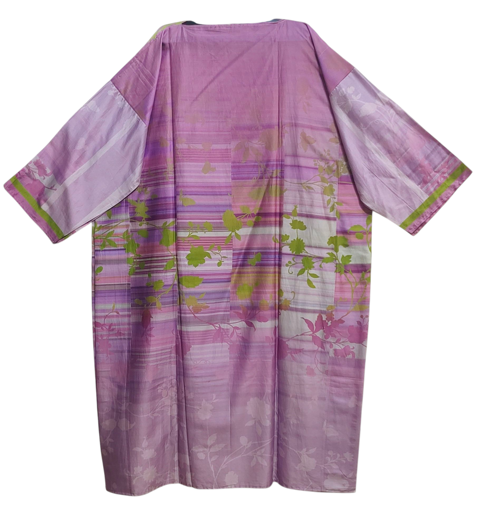 This kurta features an elegant digital printed chanderi designed in unique abstract floral theme.kurta is 48 inch maximum in length but can be shortened as per requirement as there is no neckline .The single side ghera is 34 inch so sizes upto 5XL are possible to get tailored in this material.
