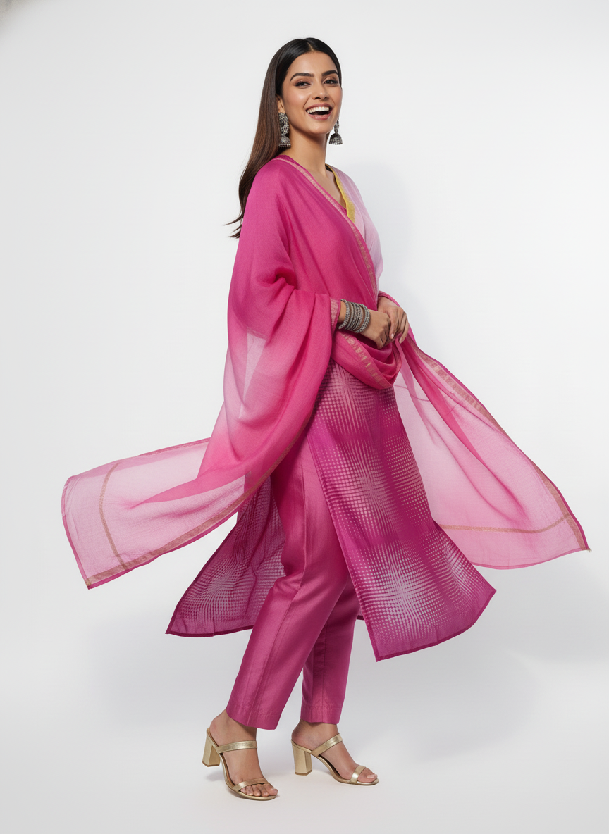 This 3 pc suitset features a knee-length magenta and pink ombré kurta with geometric grid-like white patterns, paired with a soft sheer dupatta in blush pink and fuchsia with gold trim, and a hint of yellow at the neckline, worn with matching solid colour satin trouser pants, silver oxidised jewellery in earrings and bangles, golden matching heel sandles