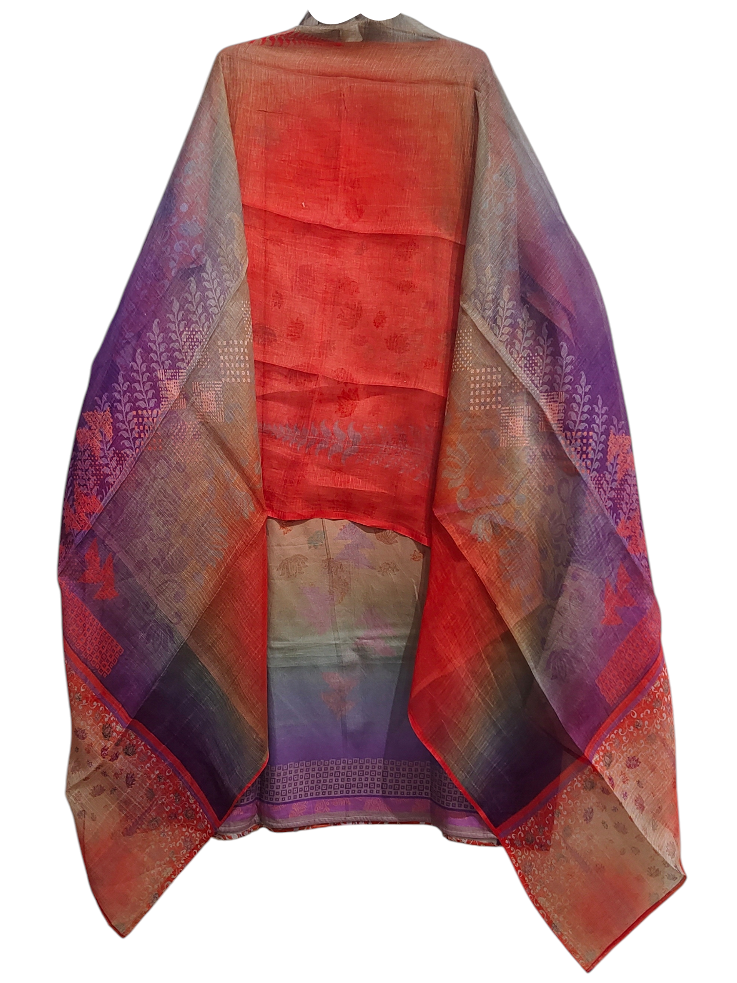 It is paired with a digital printed silk lnen kota dupatta. The dupatta measures 2.5 meters in length and 38 inches in width.the ensemble is provided with a matching cotton satin bottom material for 2.5 mts.Kurta will need lining for tailoring