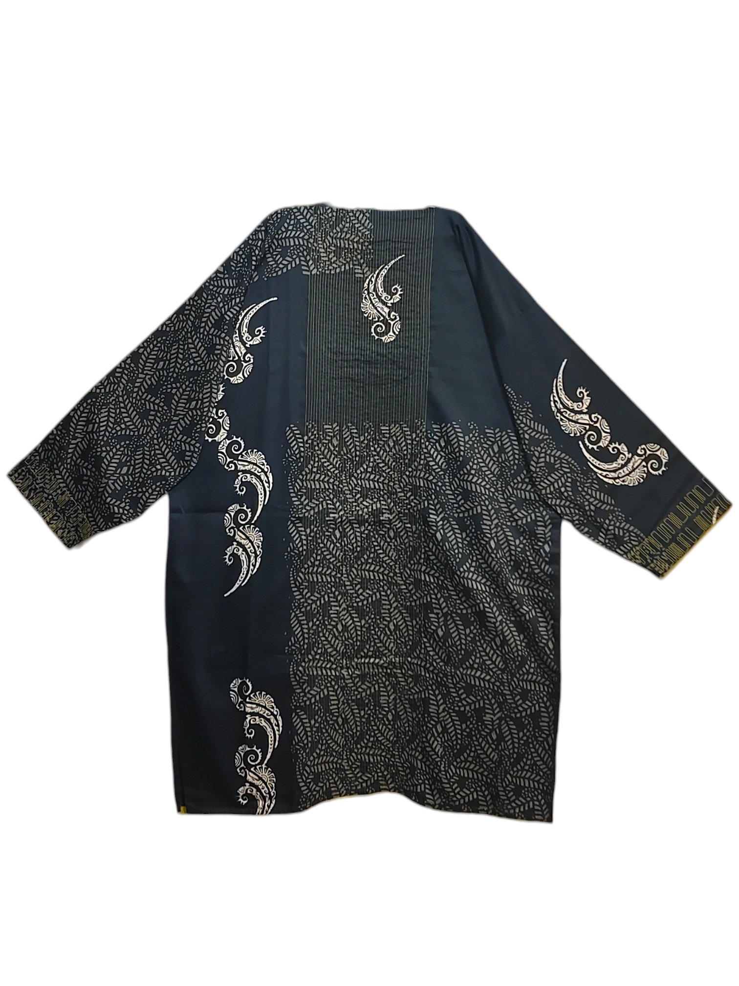 This 3 pc suitset features a knee-length relaxed-fit black satin kurta featuring white botanical motifs, vertical pinstripe detailing on the chest, and embroidered cuffs, styled with a sheer dupatta in moss green and charcoal gradient with floral and paisley embroidery in soft white and yellow tones