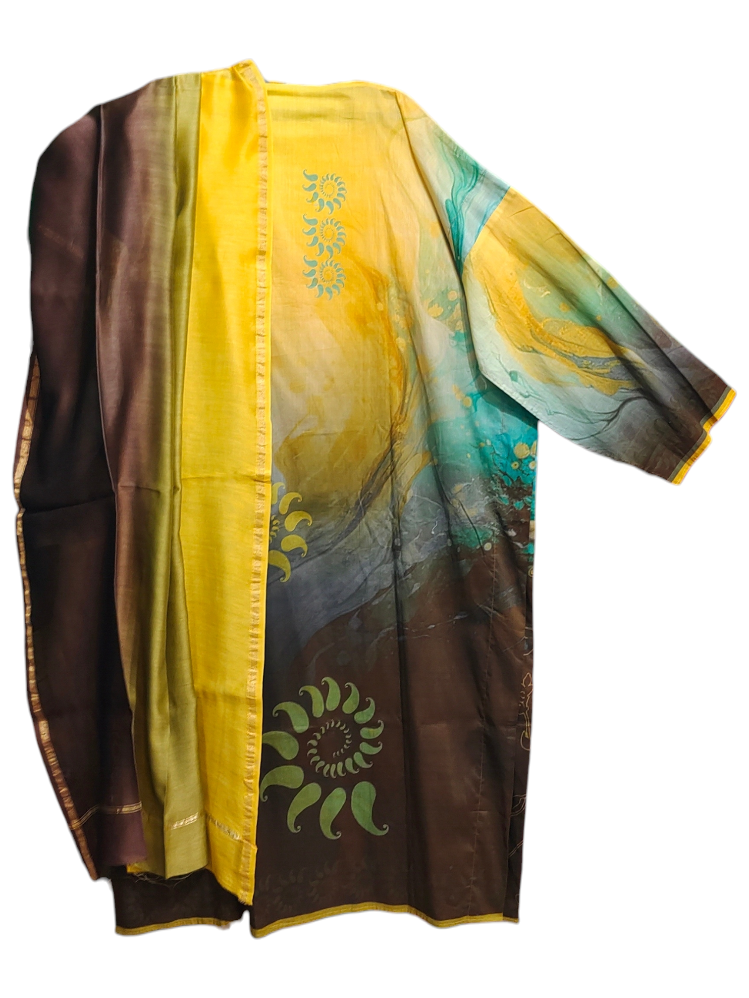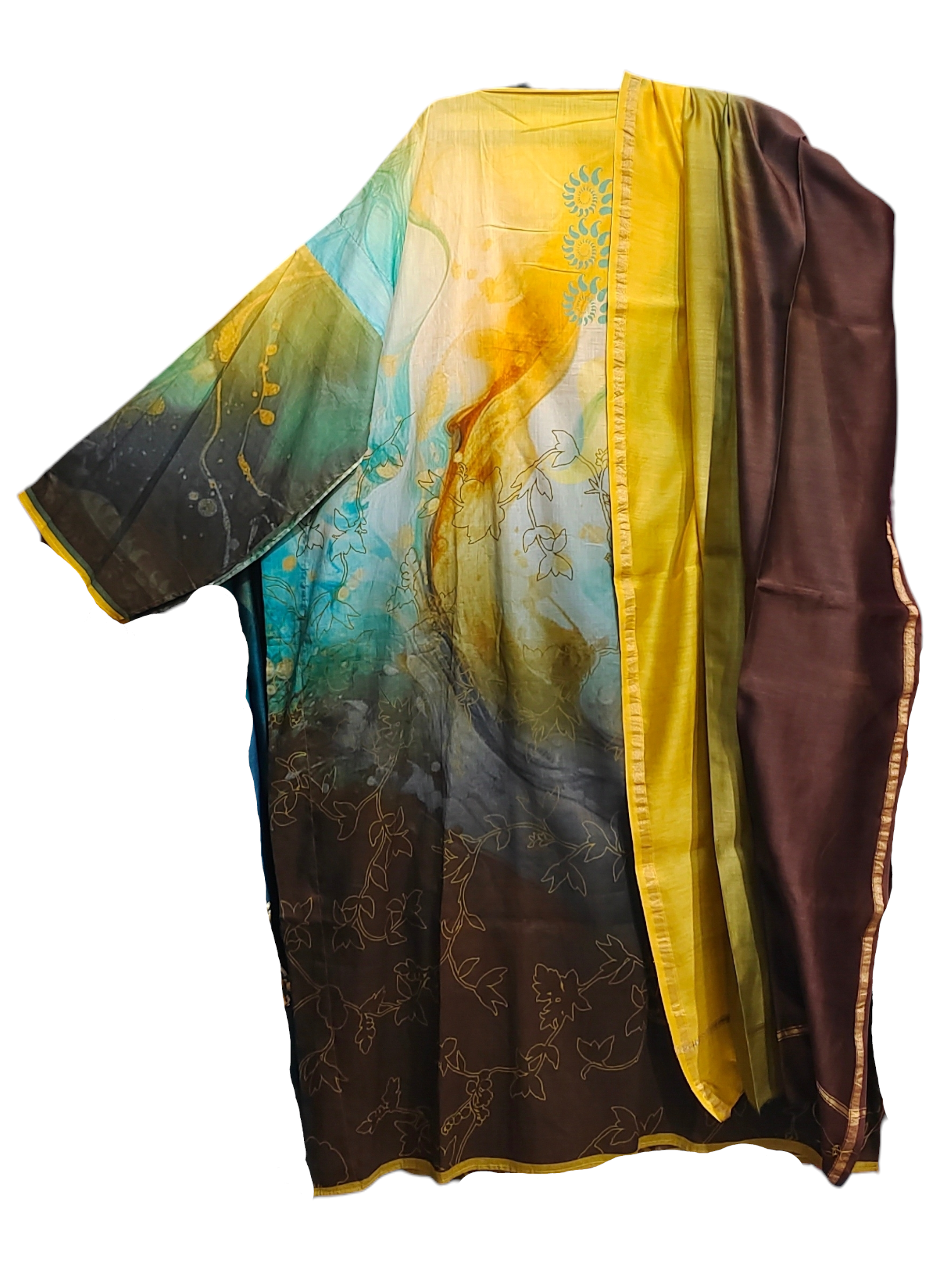 This 3 pc suitset features a mid calf-length silk kurta in gradient tones of yellow, aqua, and deep brown, featuring swirling abstract patterns and delicate floral outlines, accented with spiral sun motifs in turquoise and green, styled with a sheer tricolor dupatta in chocolate brown, ochre, and olive with gold edging