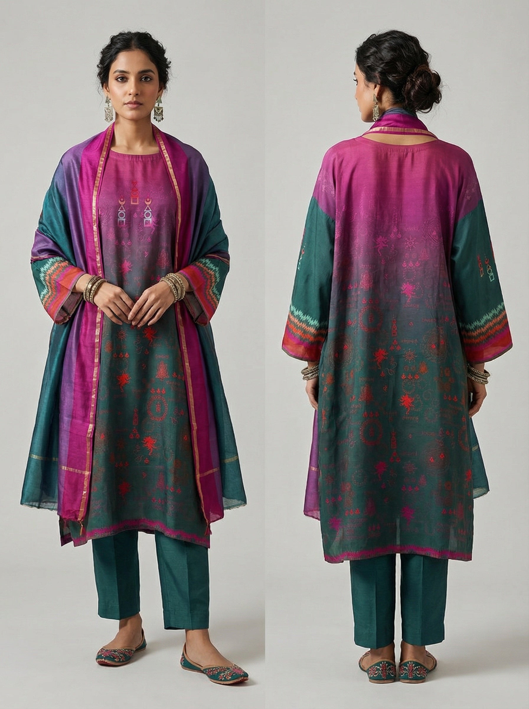 A loose-fitting calf-length cotton modal kurta in an ombré blend of magenta and deep teal, adorned with tribal-inspired and symbolic motifs in vivid red, orange, and pink embroidery, three quarter sleeves with multicolored ikat-inspired cuffs, paired with a silk dupatta in coordinating magenta, purple, and teal gradient with gold edging, styled in an artsy ethnic look