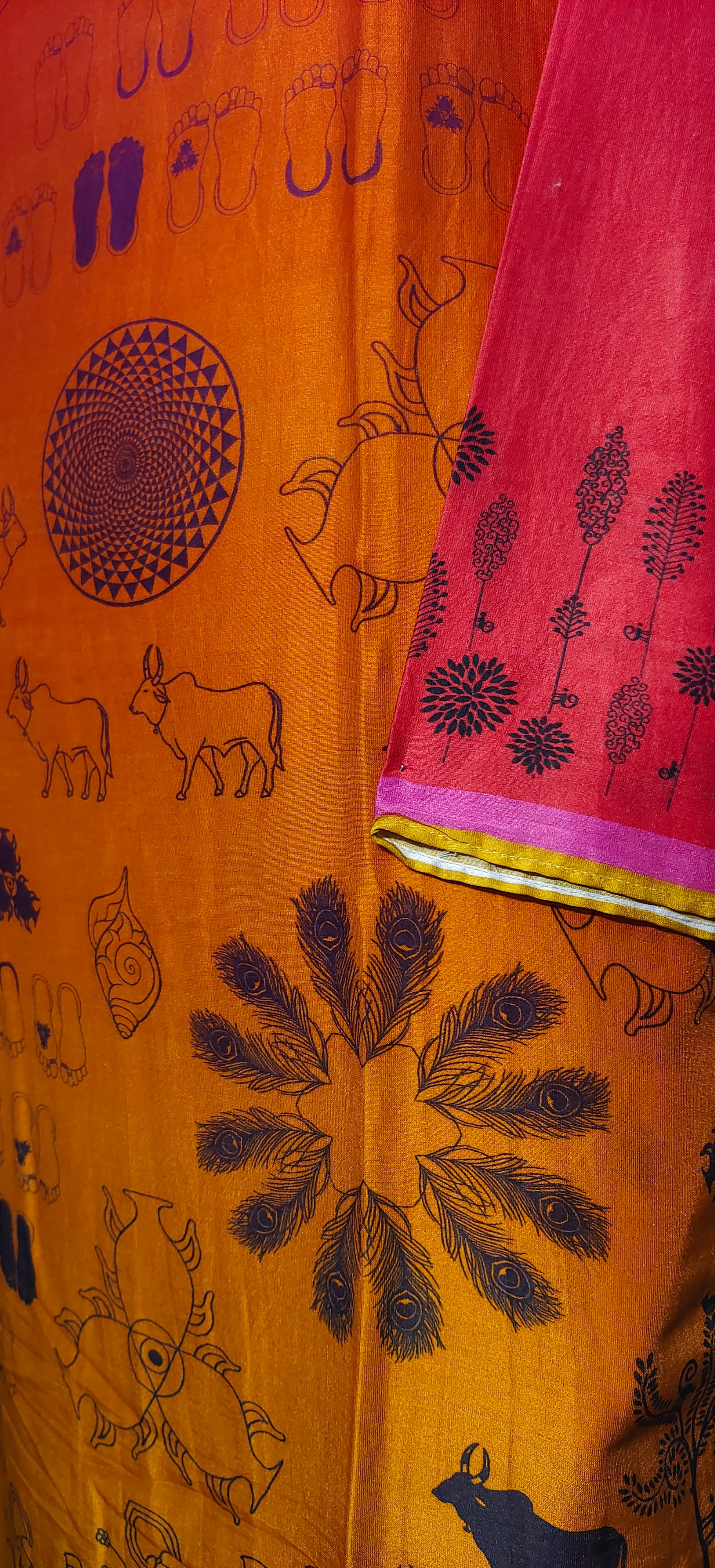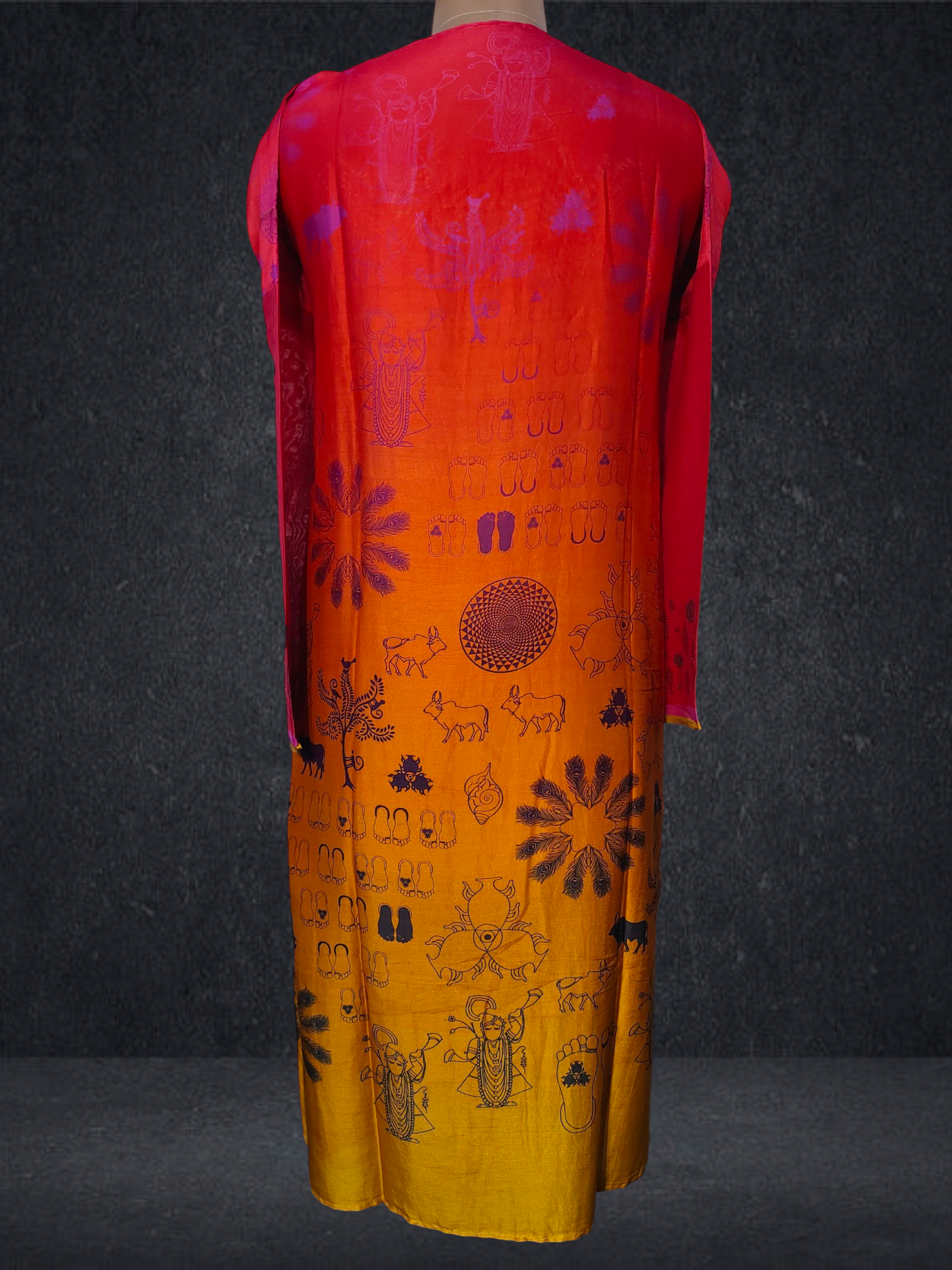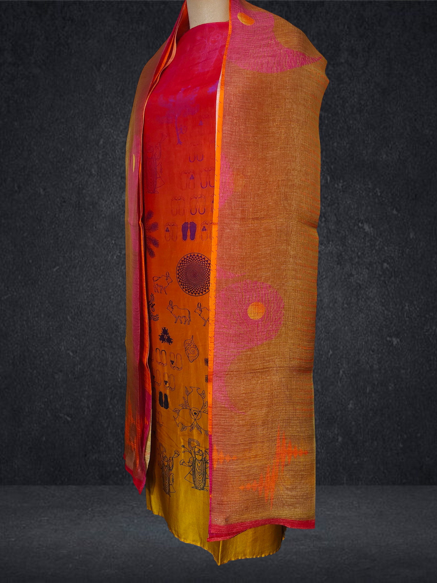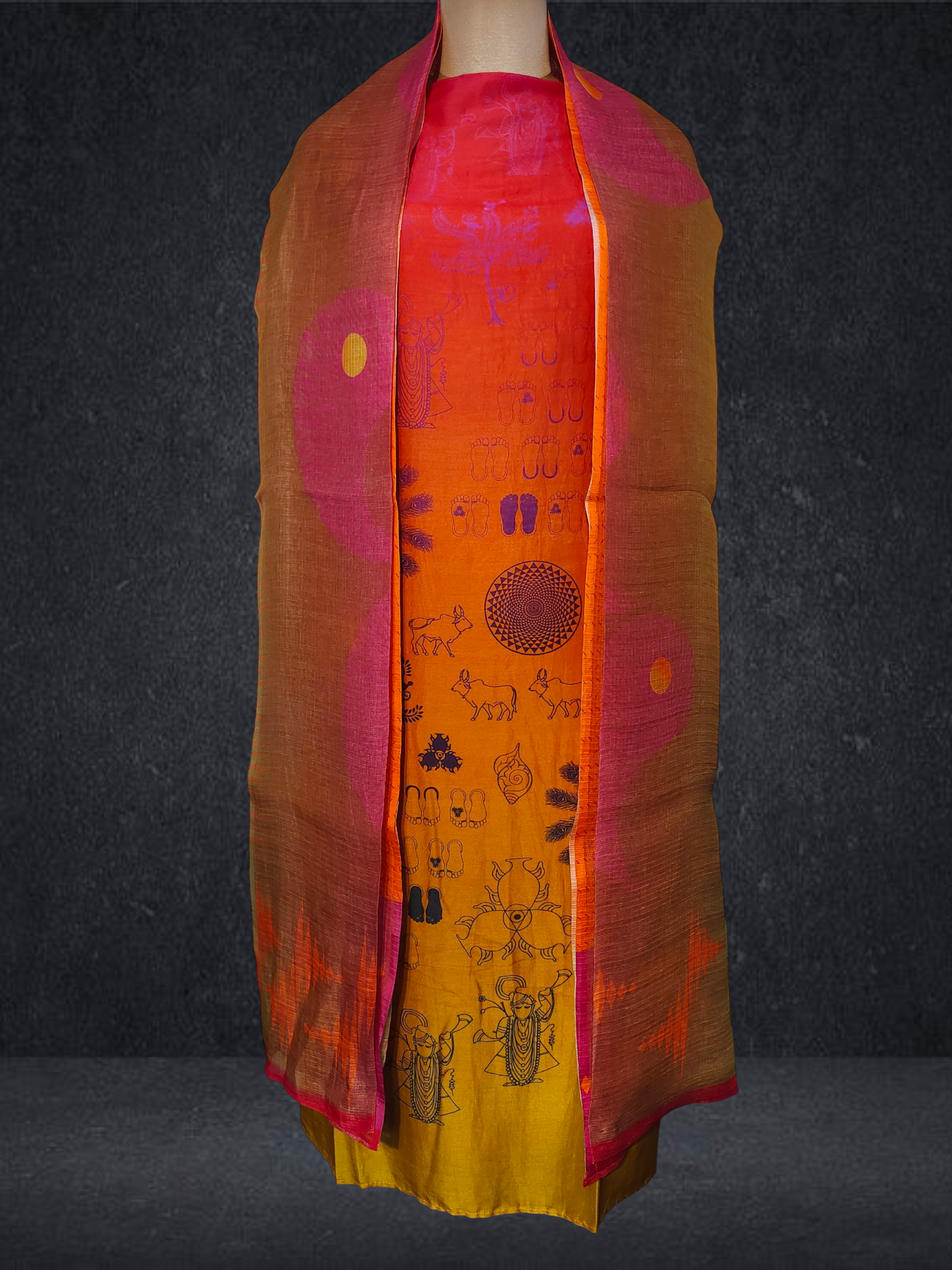 It is paired with a shaded Chanderi silk dupatta. The dupatta measures 2.5 meters in length and 38 inches in width.the ensemble is provided with a matching cotton satin bottom material for 2.5 mts.Kurta will need lining for tailoring