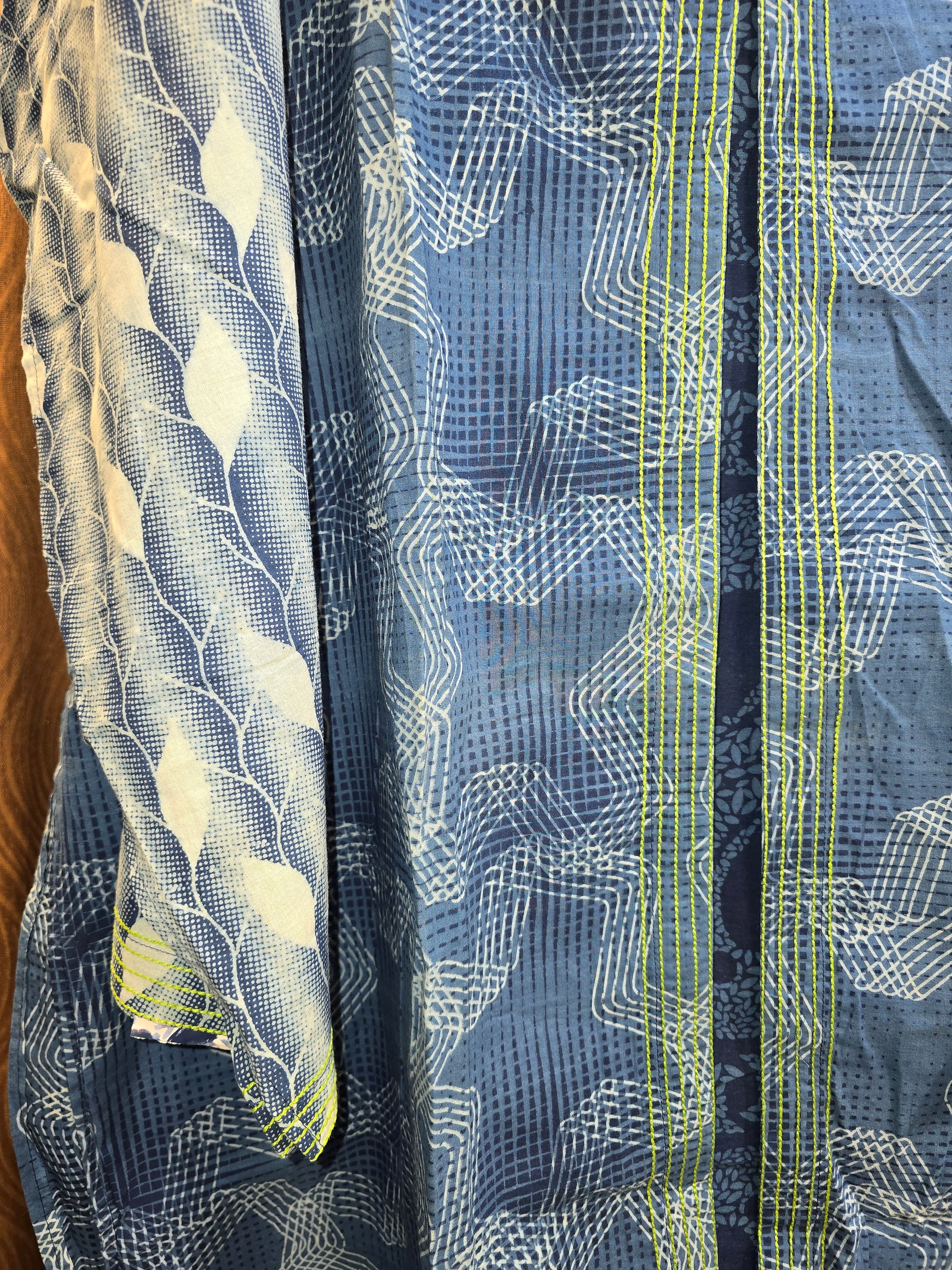 This is a loose-fit knee-length indigo blue semistitched kurta with abstract white geometric prints, featuring contrasting pale blue and white leaf-motif printed sleeves, neon green front stitch detailing and buttons, subtle round neckline with topstitch accents, in the style of modern boho ethnicwear fashion editorial, clean minimal fashion product photo, straight pose with soft natural lighting can be worn with matching trouser pants, silver oxidised jewellery in earrings and bangles, golden matching heel sandles