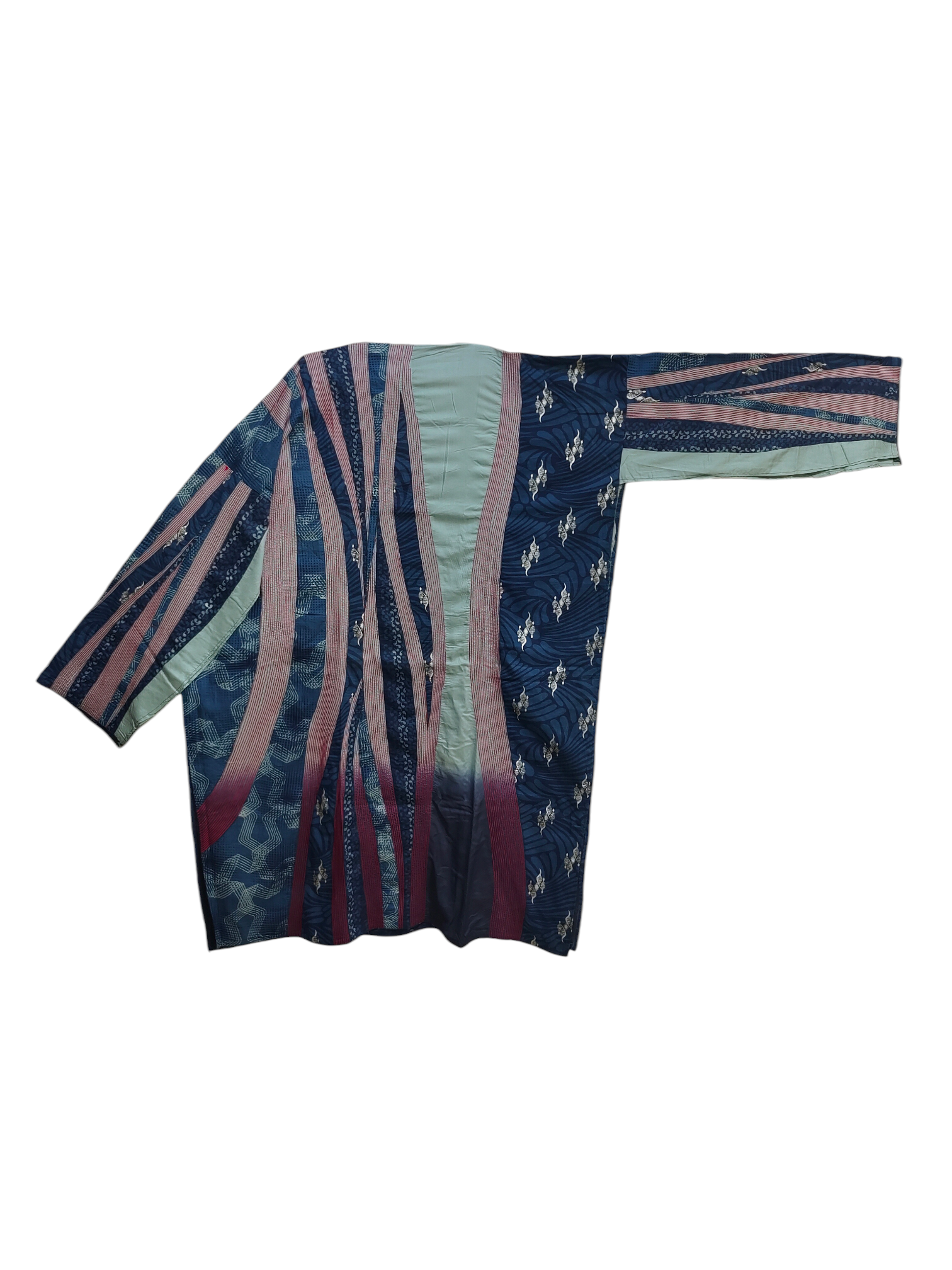 A contemporary Neel Midnight Chanderi kurta that explores graphic paneling with a refined artisanal sensibility. The surface is composed through contrasting vertical bands and wave-inspired textures, interspersed with delicate buti accents that lend subtle movement. Muted blush-toned linear inserts soften the deep base, creating a balanced visual rhythm. The silhouette remains fluid and structured, making it a versatile expression for elevated day-to-evening dressing.