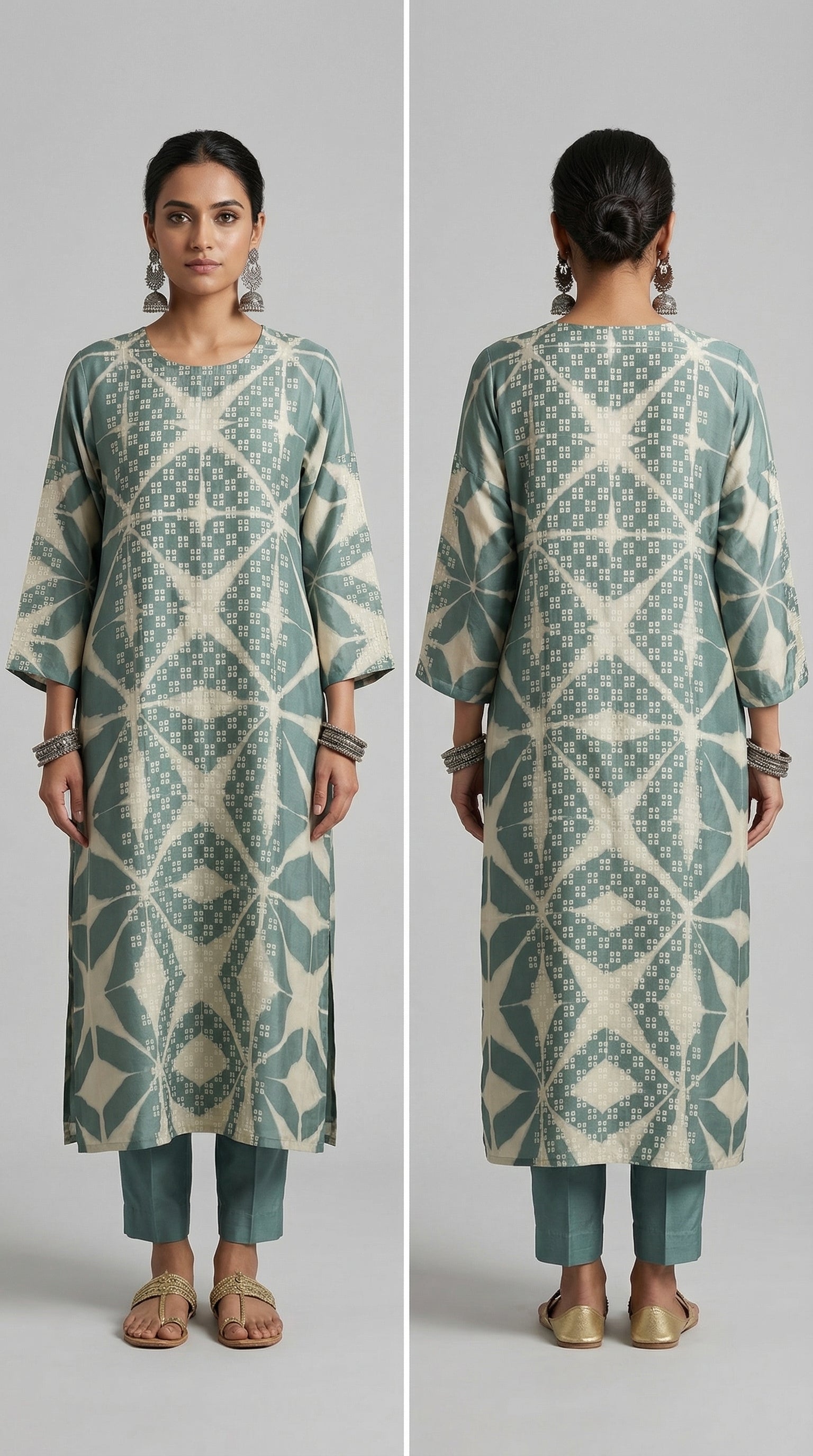 A muted Sage Teal Chanderi kurta that reflects a calm, earthy sensibility through resist-dye inspired artistry. The surface features soft shibori starburst patterns layered with a central panel of intricate dotted geometry, creating a harmonious interplay of fluid and structured design. The subdued tonal palette lends quiet sophistication, while the lightweight drape enhances its effortless wearability—ideal for understated day occasions.