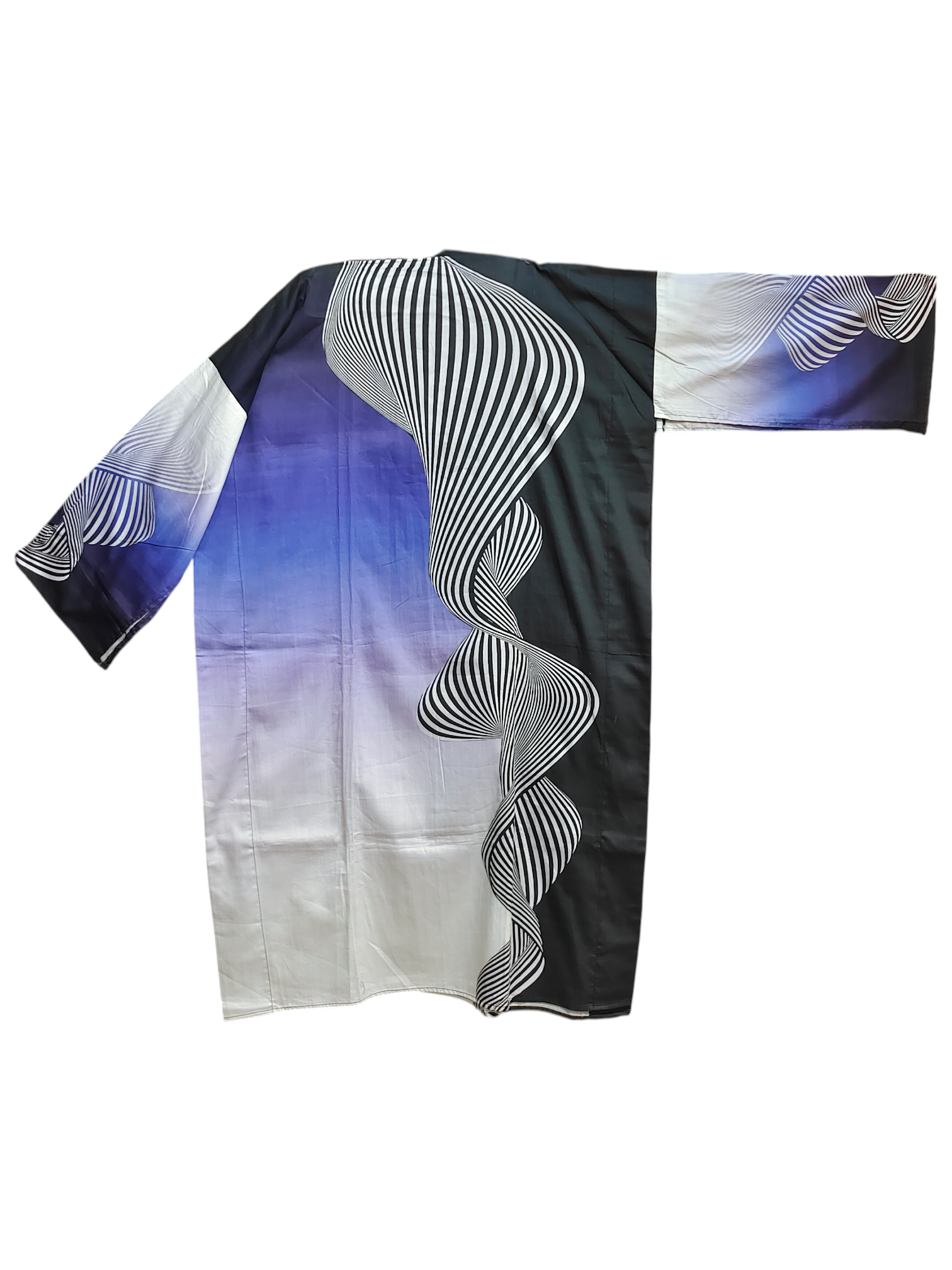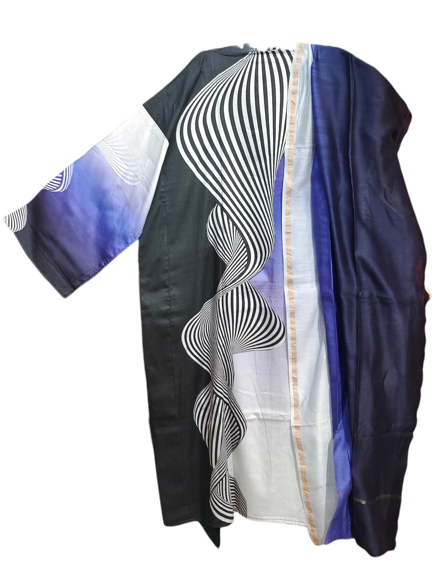 An avant-garde mid calf length kurta with a bold ombré gradient from deep navy to ivory, featuring striking black-and-white optical illusion wave motifs, three quarter sleeves with digital swirl prints, and a relaxed silhouette with side slits, made from cotton satin fabric, paired with a dark blue to white ombre chanderi dupatta