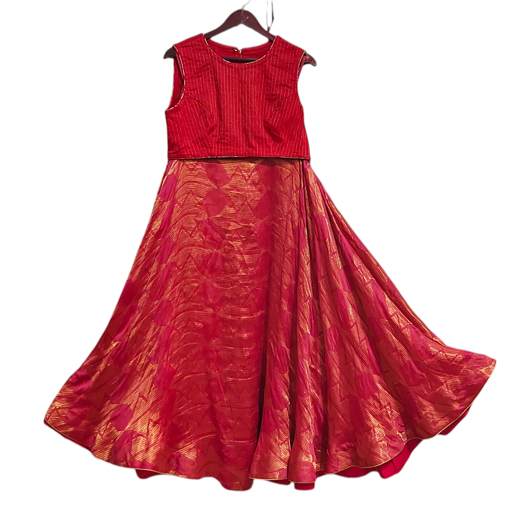 A sleeveless cropped red blouse with fine vertical pintucks, paired with a flowing full-length flared skirt in coral pinkish red and gold woven brocade, and layered with a short-sleeved cropped jacket in vibrant fuchsia pink with multicolor circular and floral embroidered motifs, finished with a striking mustard yellow wide lapel collar