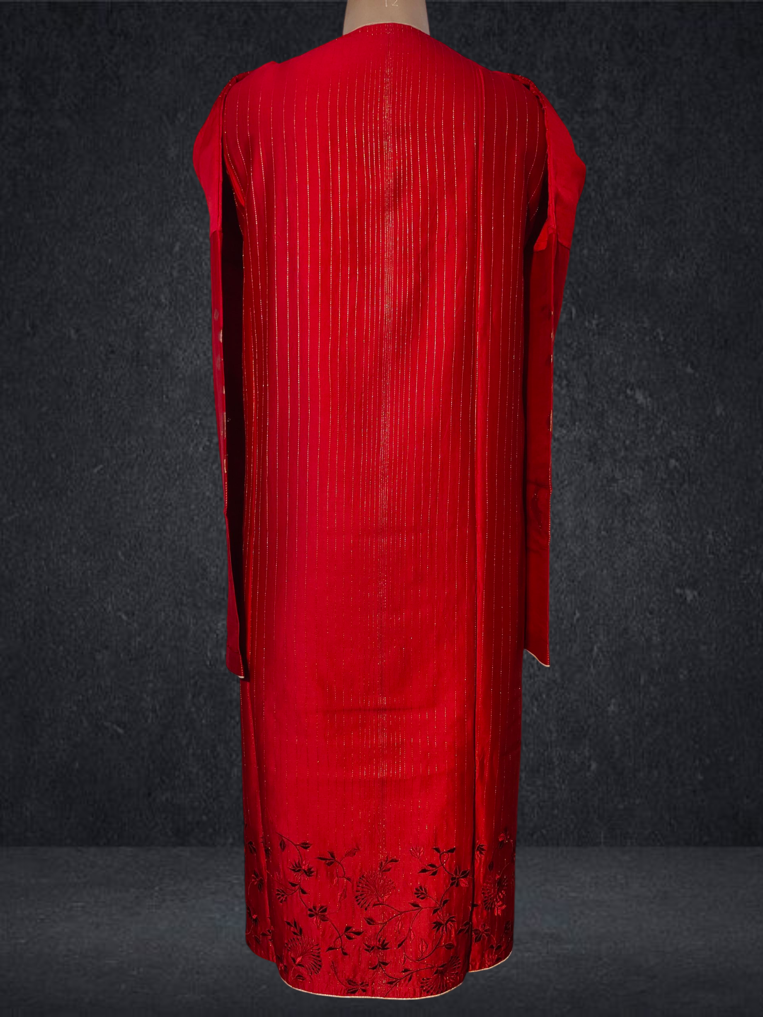 It is paired with a shaded Chanderi dupatta with floral motifs. The dupatta measures 2.5 meters in length and 38 inches in width.The ensemble is provided with a matching cotton satin bottom material for 2.5 mts.