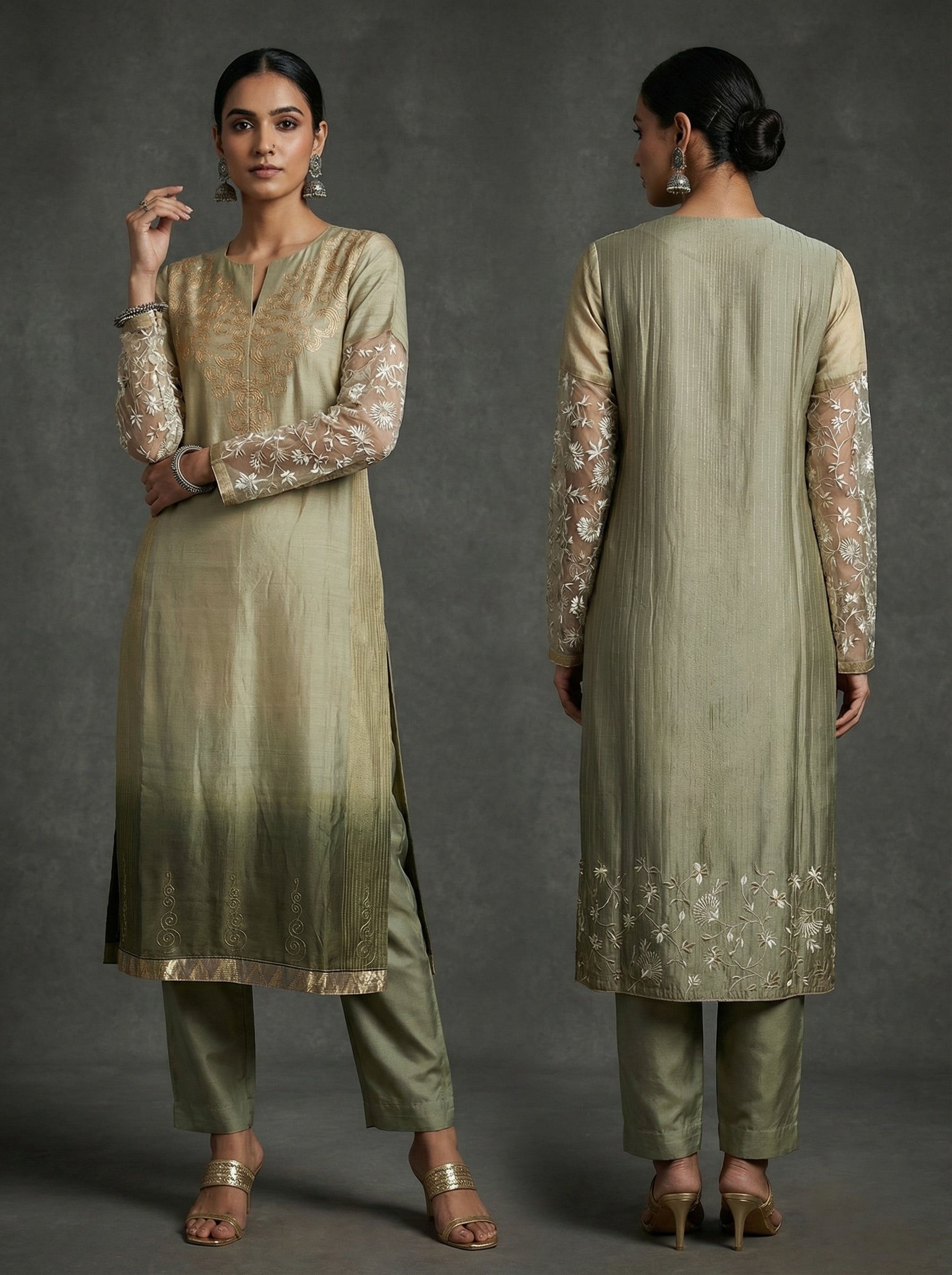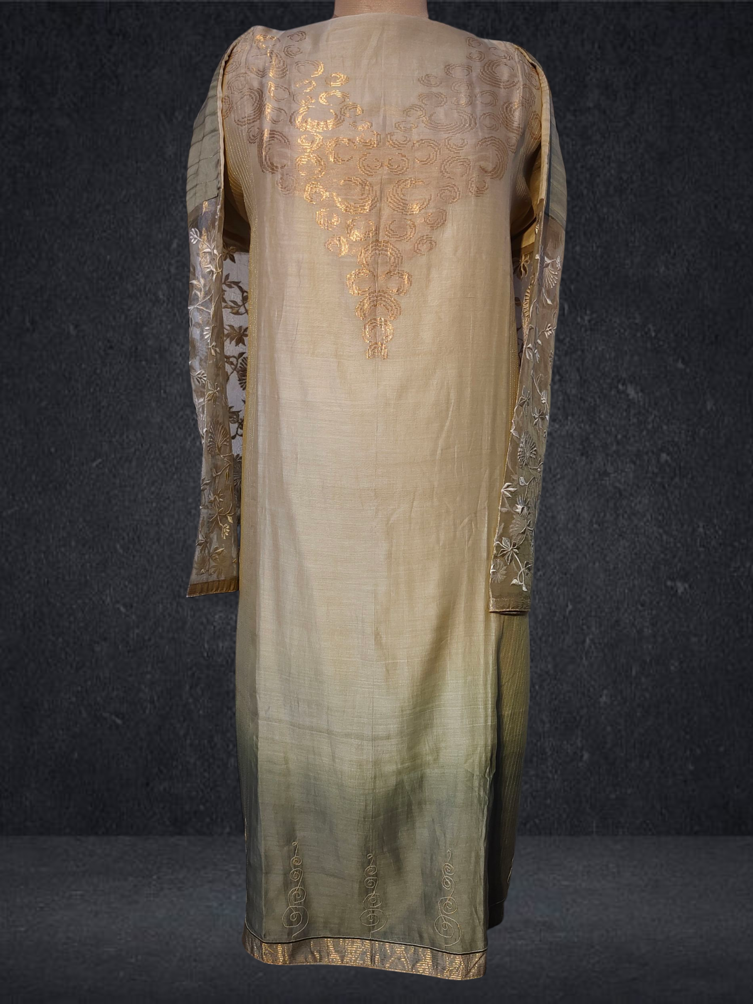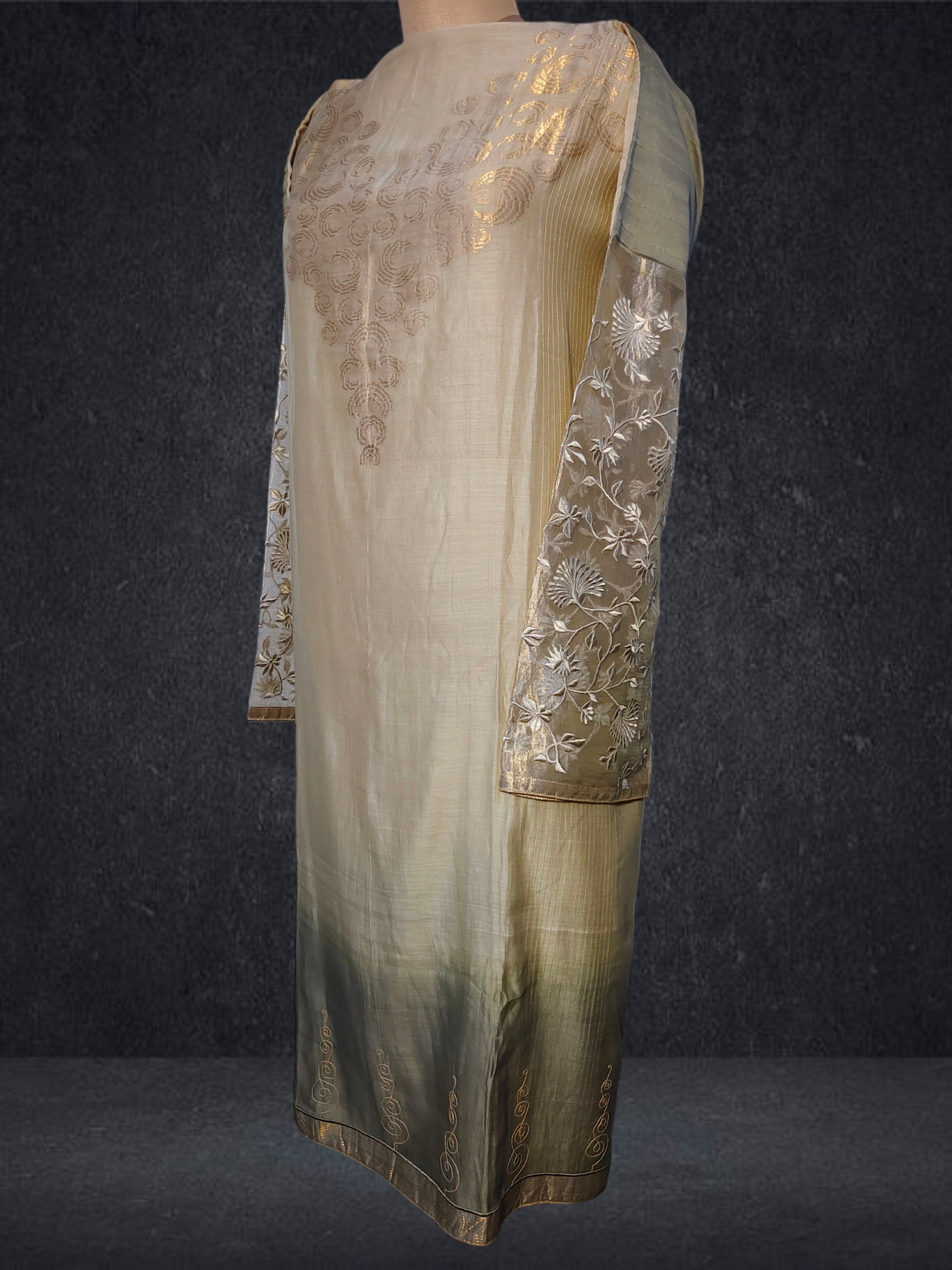 It is paired with a shaded Chanderi dupatta with floral motifs. The dupatta measures 2.5 meters in length and 38 inches in width.The ensemble is provided with a matching cotton satin bottom material for 2.5 mts.