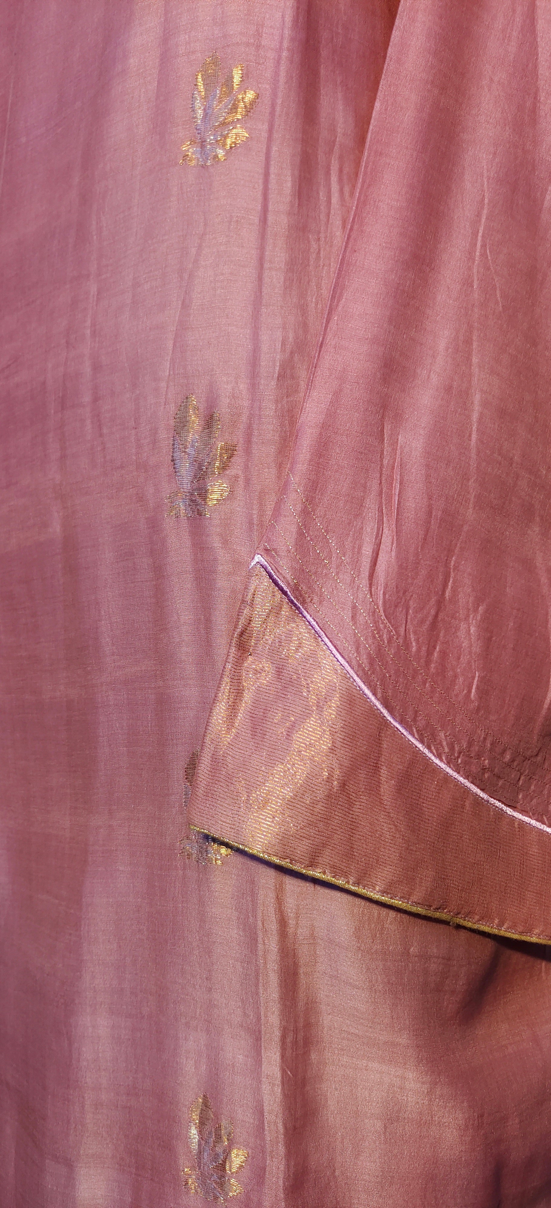 This 3 pc suitset features an elegant zari woven buta kurta and textured chanderi designed in unique abstract floral theme.Kurta is 48 inch maximum in length but can be shortened as per requirement as there is no neckline .The single side ghera is 34 inch so sizes upto 5XL are possible to get tailored in this material.The kurta is prelined with cotton mal.