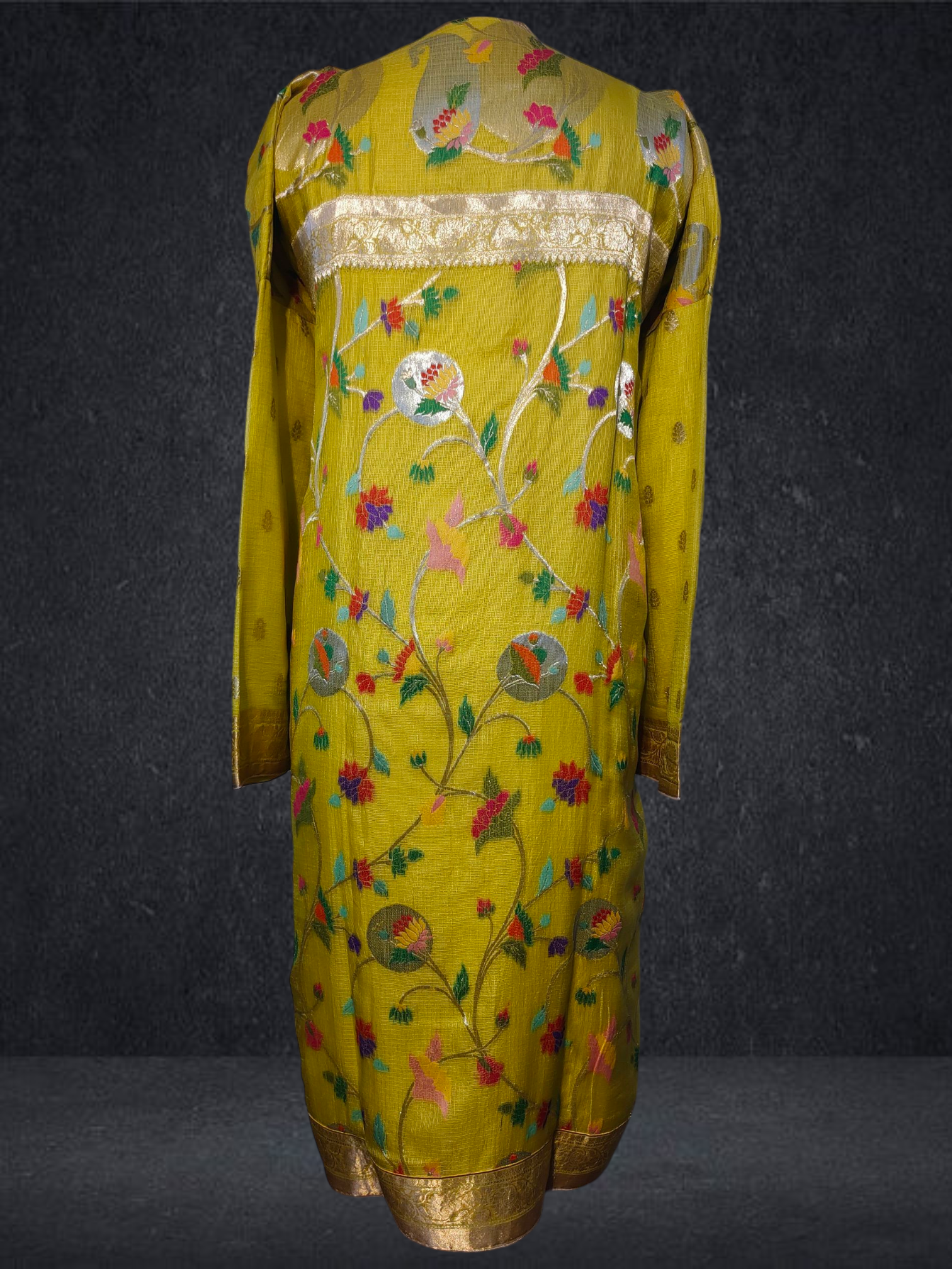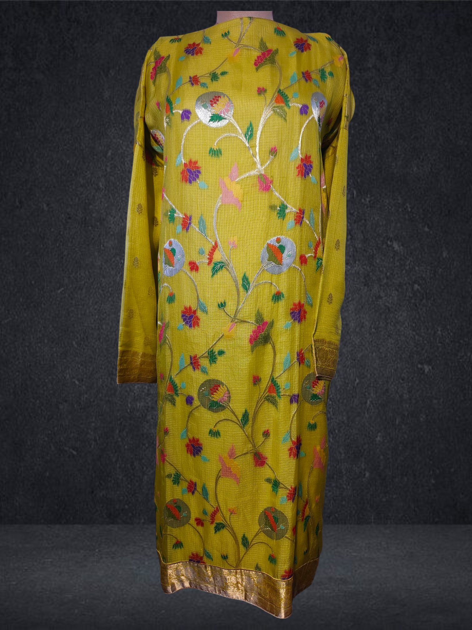 This 3 pc suitset features an elegant zari woven buta kurta and textured chanderi designed in unique abstract floral theme.Kurta is 48 inch maximum in length but can be shortened as per requirement as there is no neckline .The single side ghera is 34 inch so sizes upto 5XL are possible to get tailored in this material.The kurta is prelined with cotton mal.