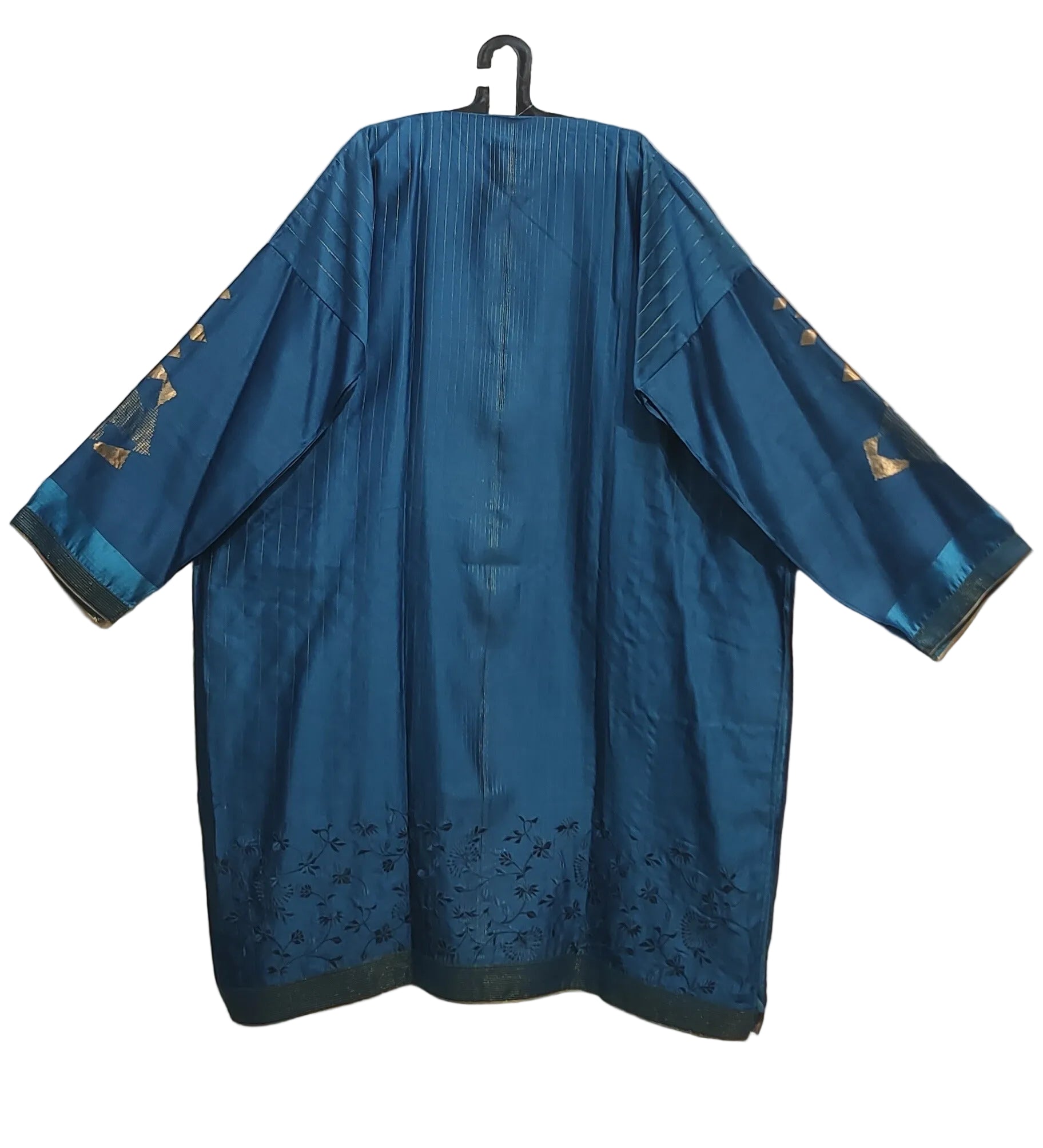 This is a knee-length 48 inch long deep blue chanderi silk kurta with zari woven abstract floral motifs