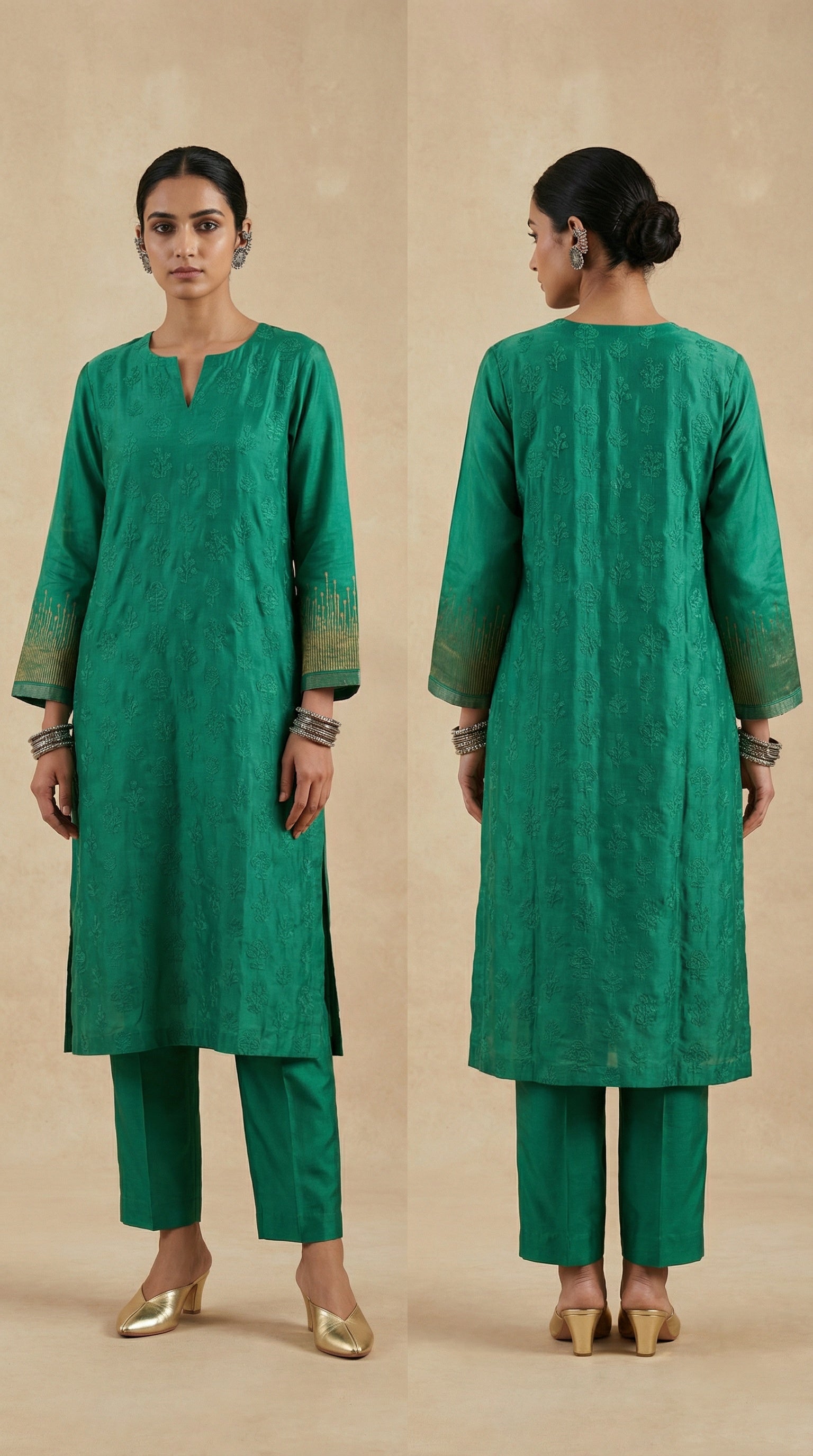 A emerald green silk kurta with all-over tonal floral embroidery and subtle golden detailing on the sleeves and cuffs,