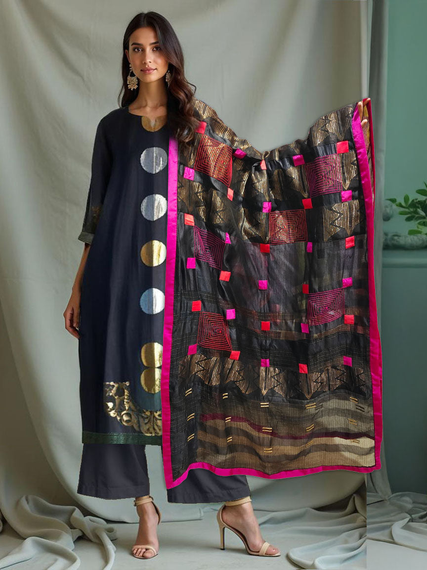 This semi-stitched kurta can be adjusted to fit up to 48 inches in length and a maximum ghera width of 32 inches on one side. Dupatta features zari woven jacquard zari panels on a black zari katan soft organza check design base fabric edged with rani pink piping.Dupatta length is 2.5 mtrs and the width is 38 inches.