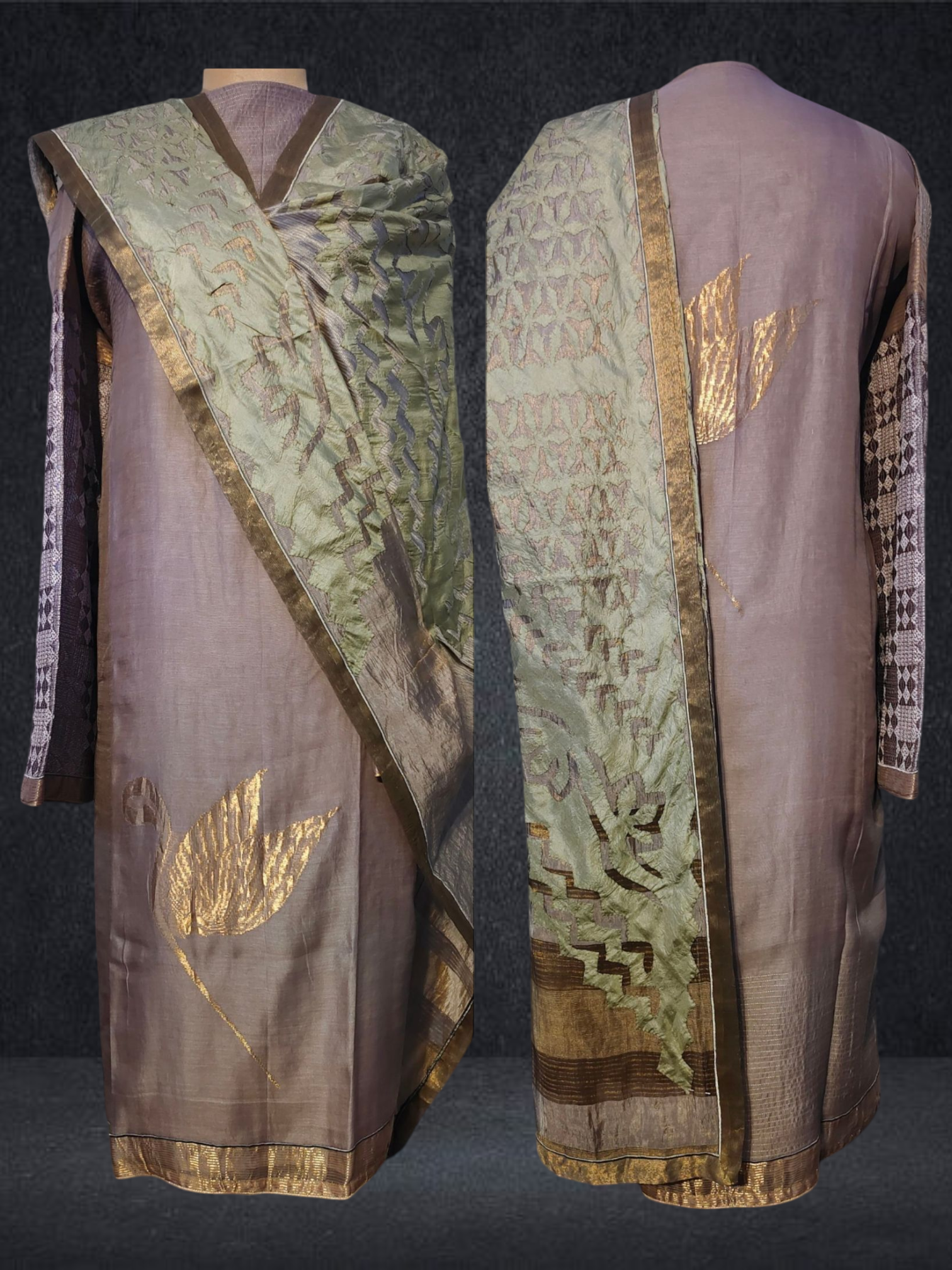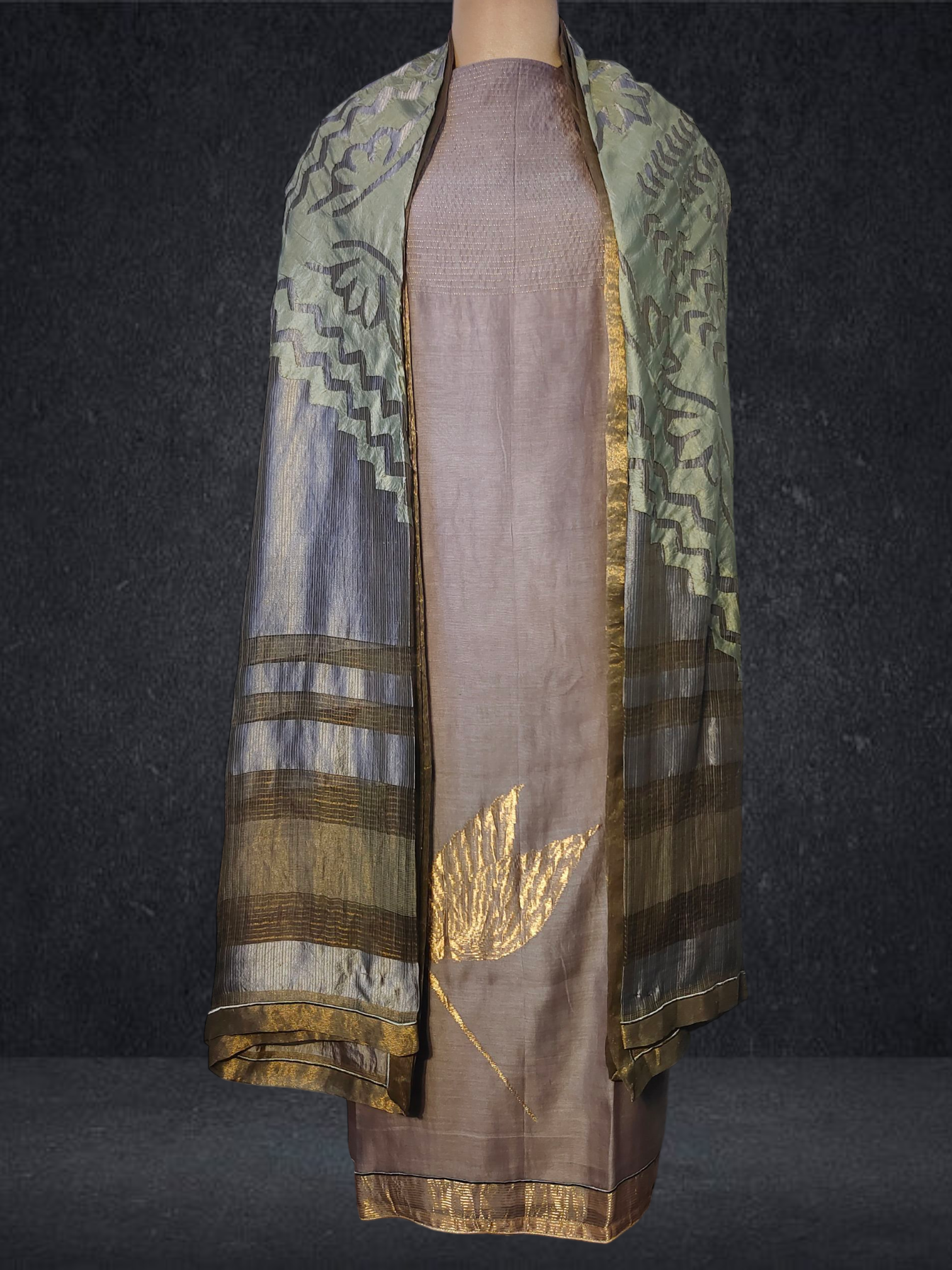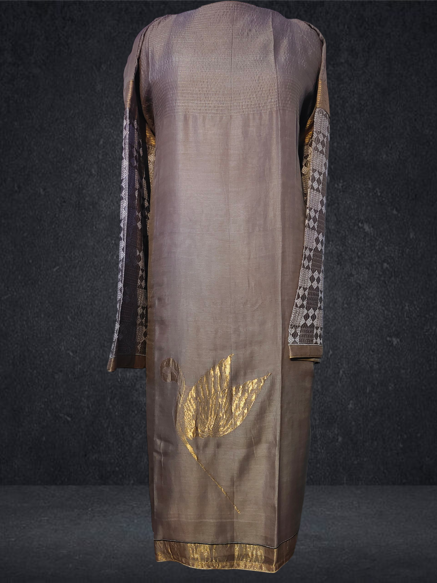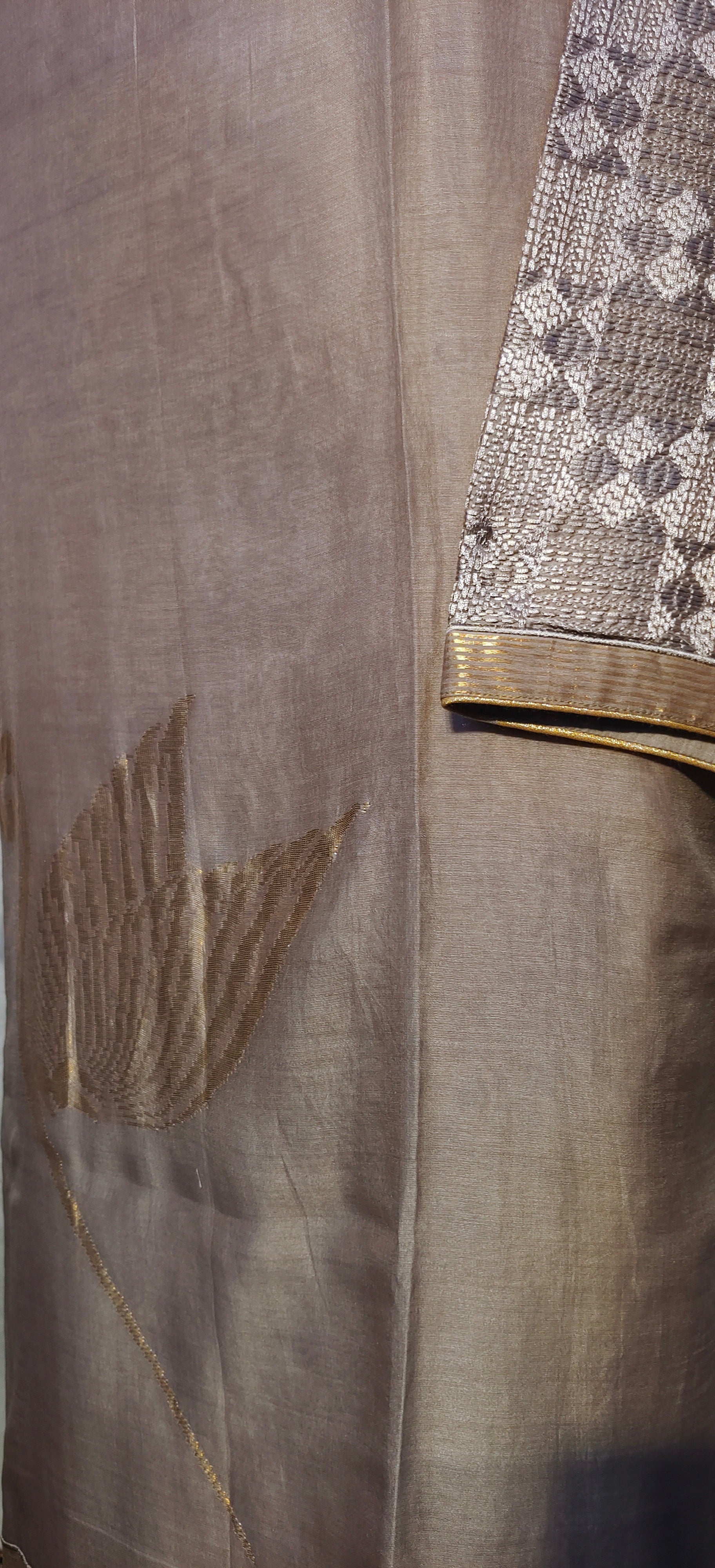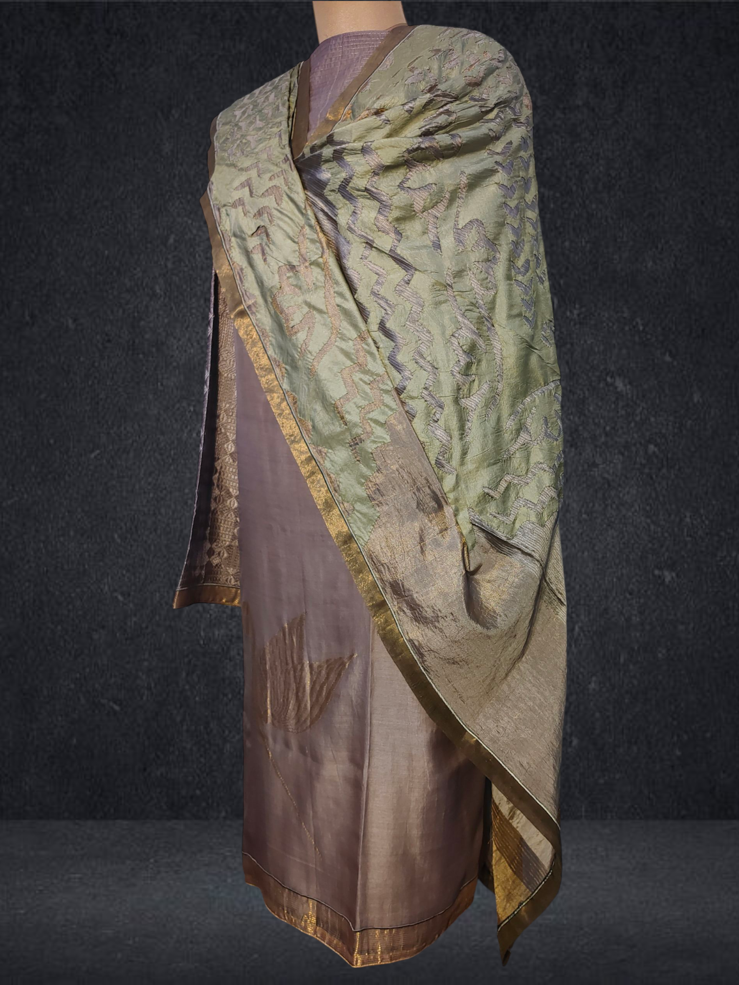 This 3 pc suitset features an elegant zari woven buta kurta and textured chanderi designed in unique abstract floral theme.Kurta is 48 inch maximum in length but can be shortened as per requirement as there is no neckline .The single side ghera is 34 inch so sizes upto 5XL are possible to get tailored in this material.The kurta is prelined with cotton mal.