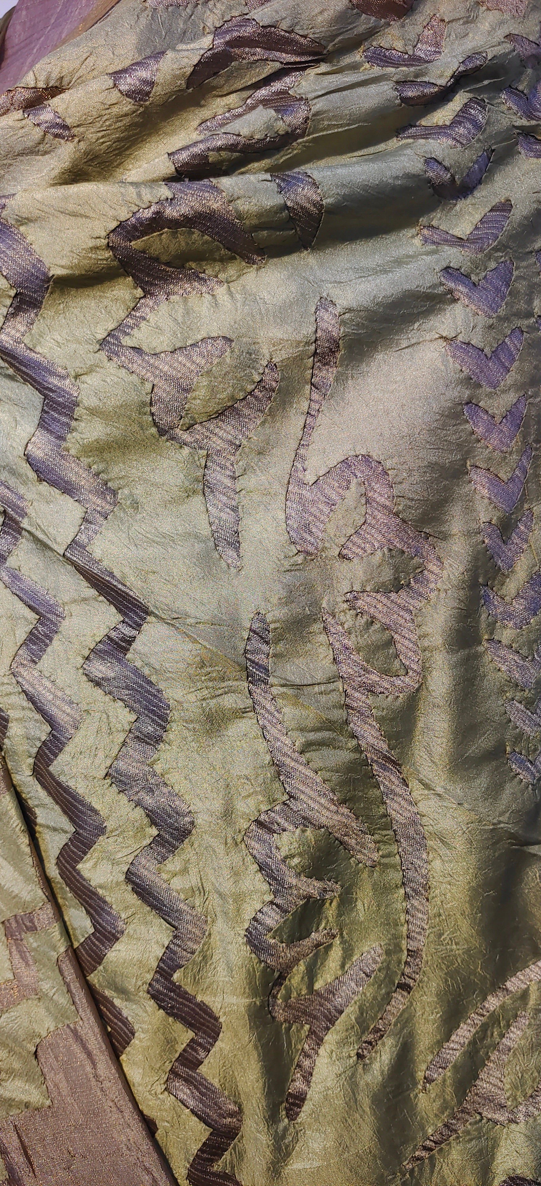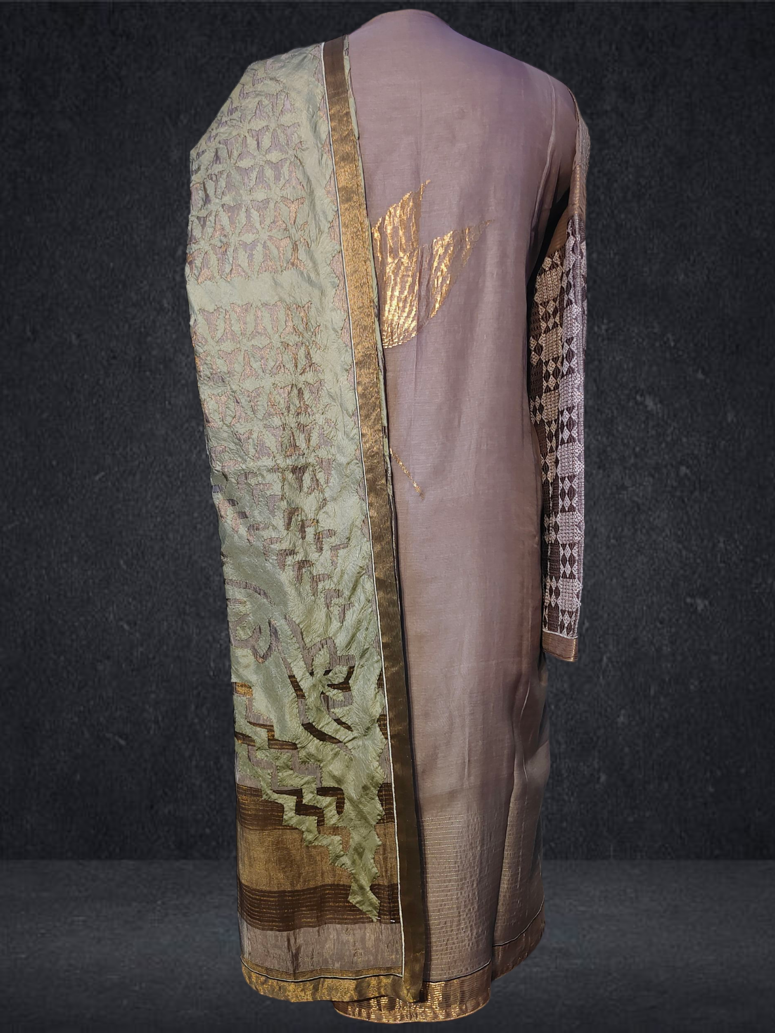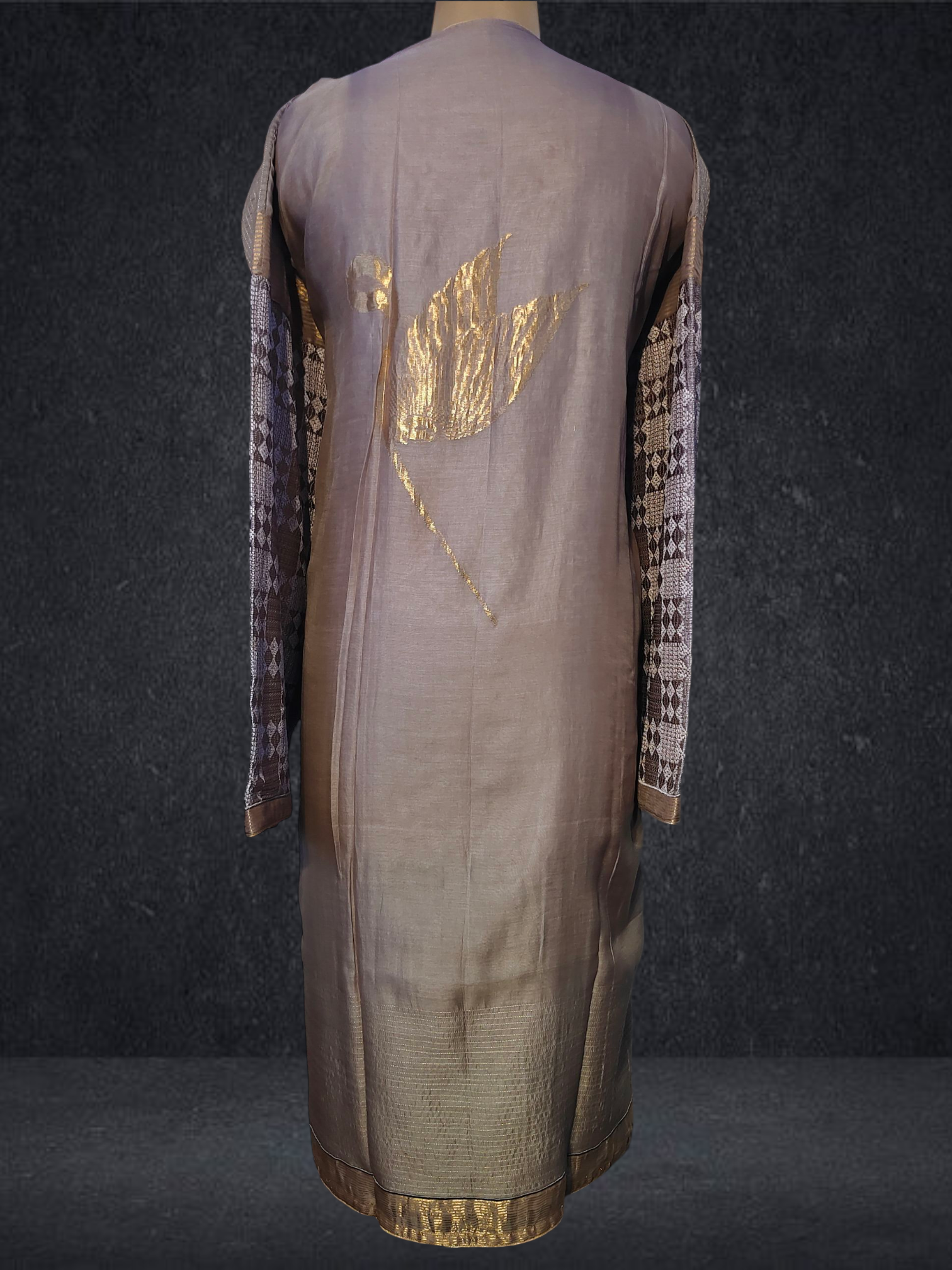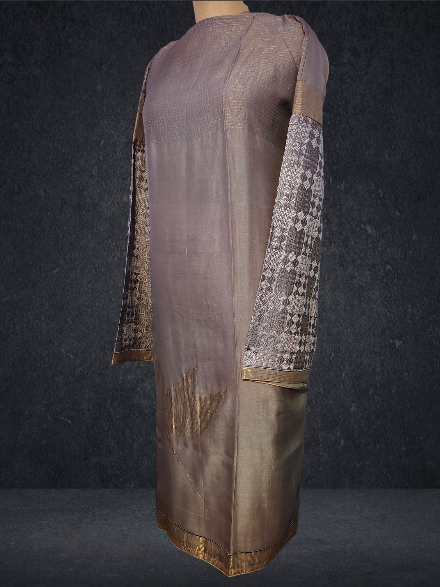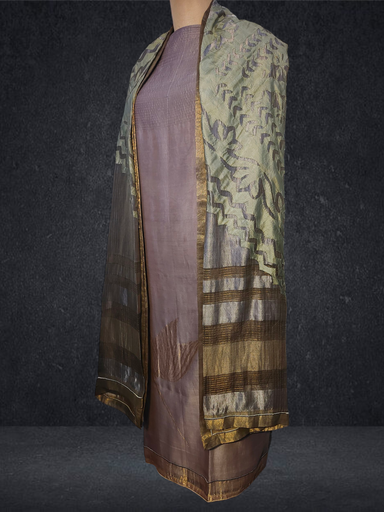 This 3 pc suitset features an elegant zari woven buta kurta and textured chanderi designed in unique abstract floral theme.Kurta is 48 inch maximum in length but can be shortened as per requirement as there is no neckline .The single side ghera is 34 inch so sizes upto 5XL are possible to get tailored in this material.The kurta is prelined with cotton mal.