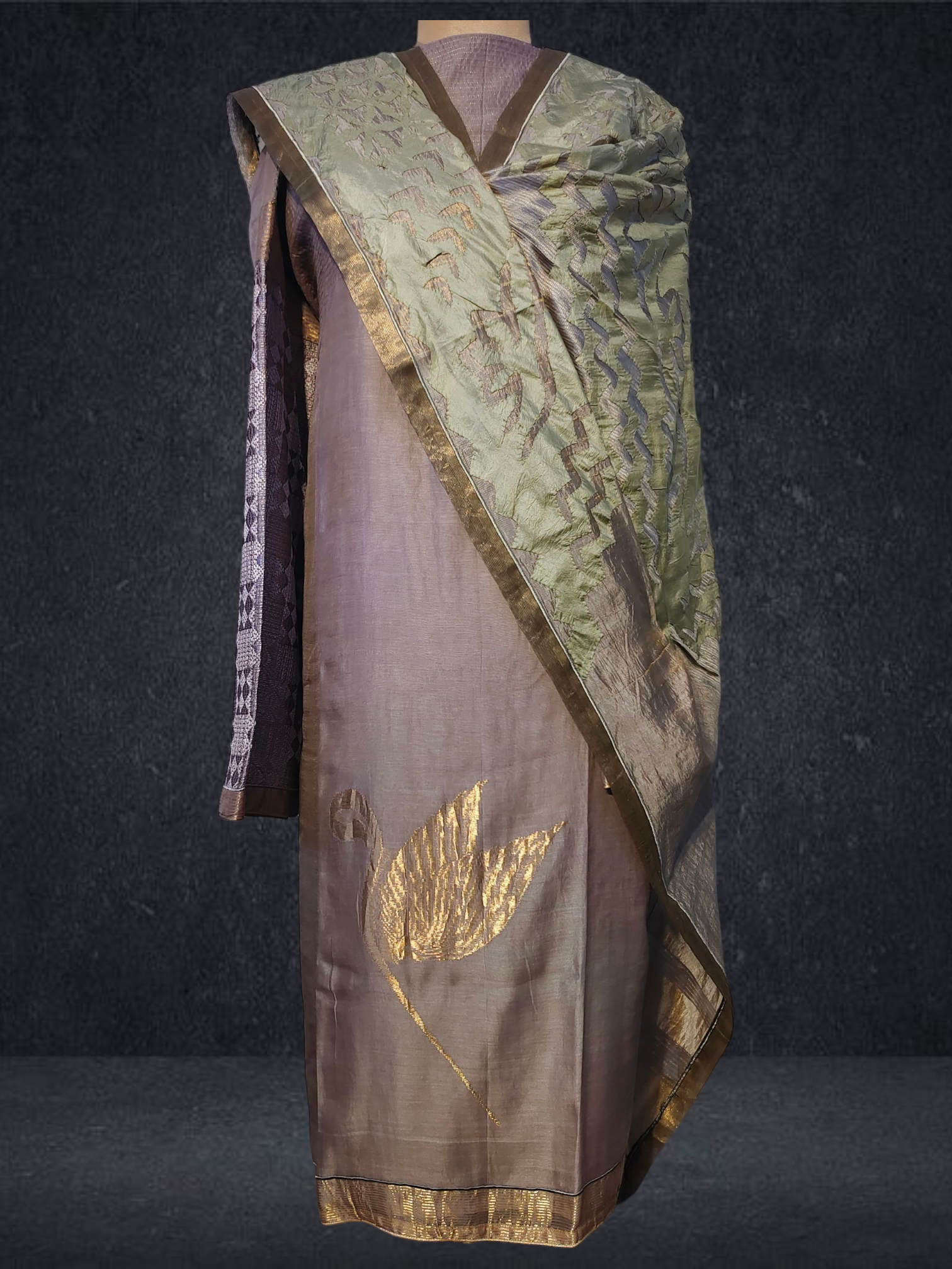 It is paired with a shaded Chanderi dupatta with floral motifs. The dupatta measures 2.5 meters in length and 38 inches in width.The ensemble is provided with a matching cotton satin bottom material for 2.5 mts.