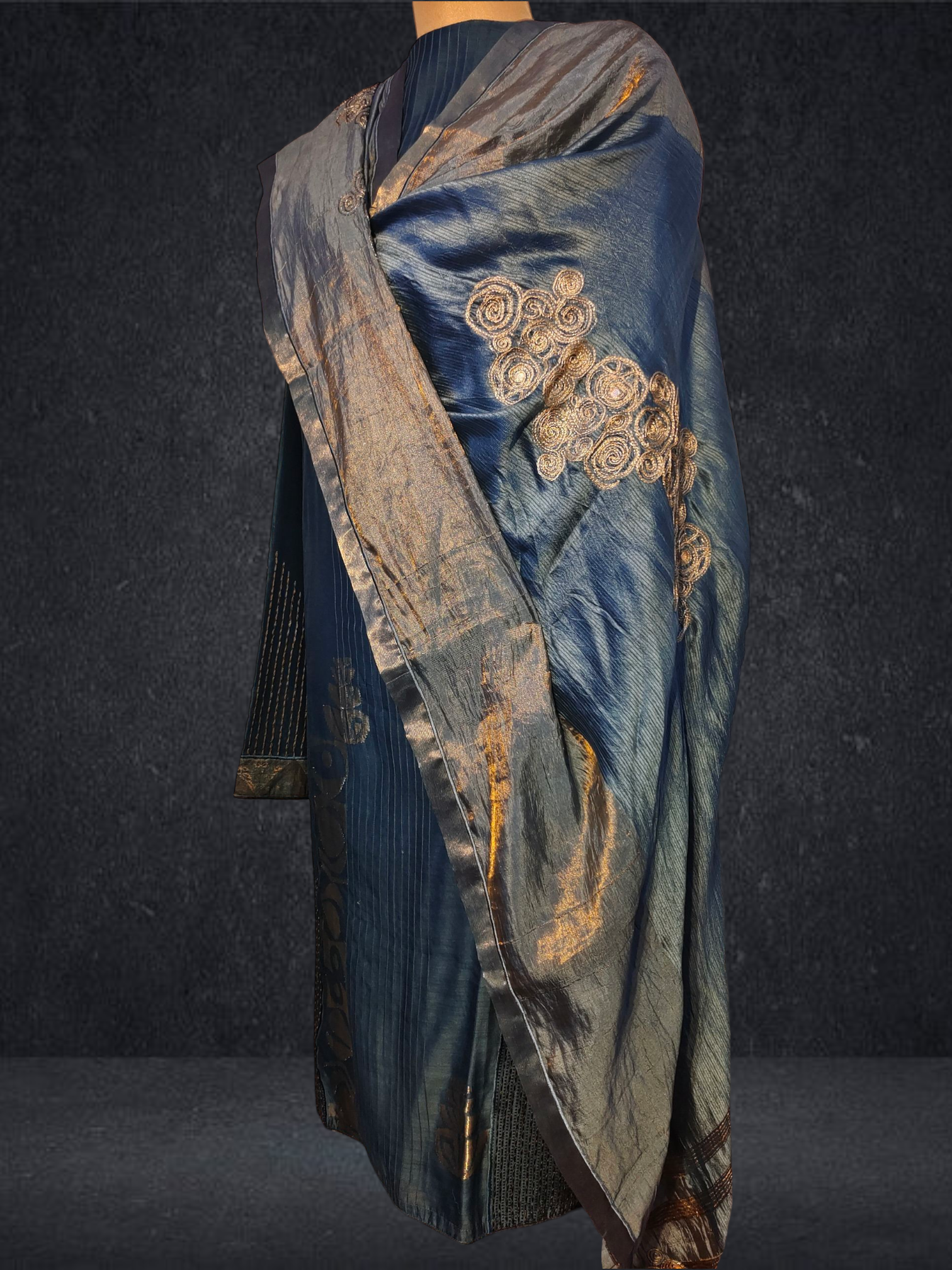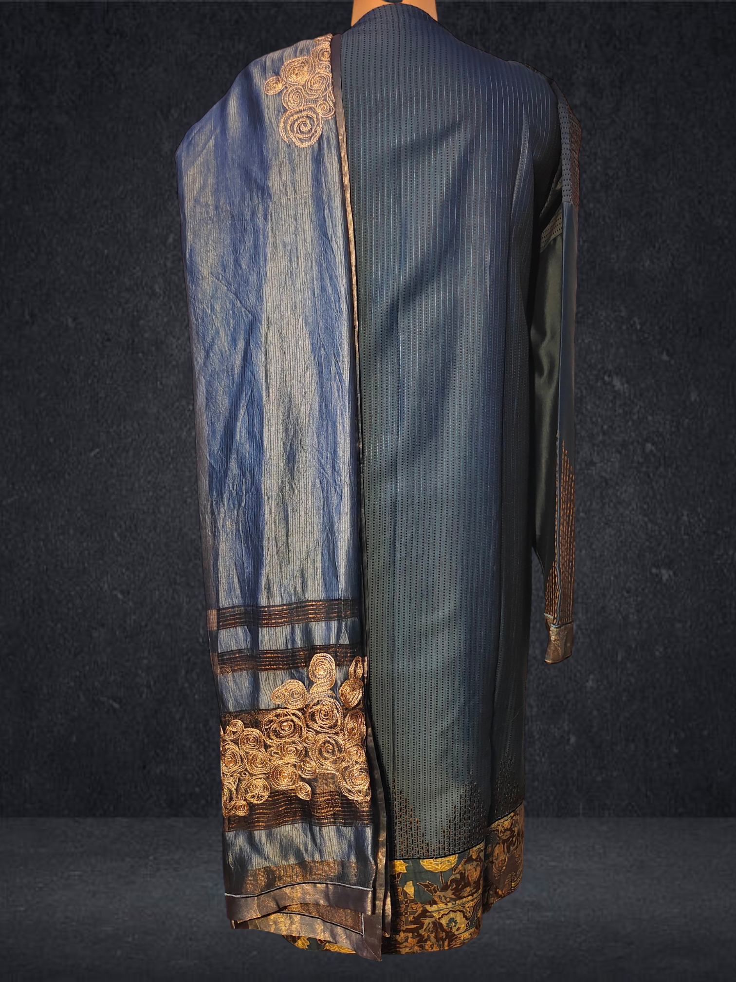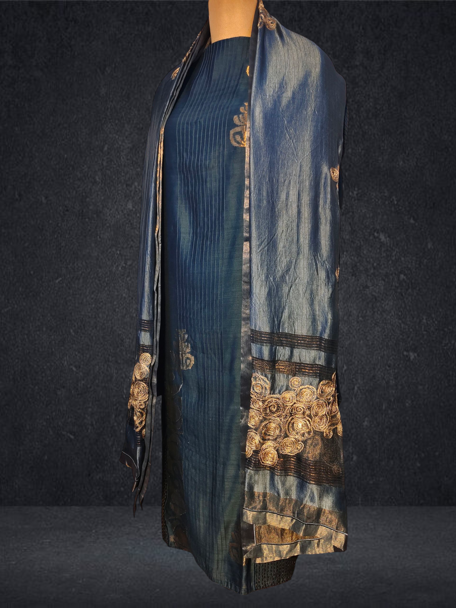 This 3 pc suitset features an elegant zari woven buta kurta and textured chanderi designed in unique abstract floral theme.Kurta is 48 inch maximum in length but can be shortened as per requirement as there is no neckline .The single side ghera is 34 inch so sizes upto 5XL are possible to get tailored in this material.The kurta is prelined with cotton mal.