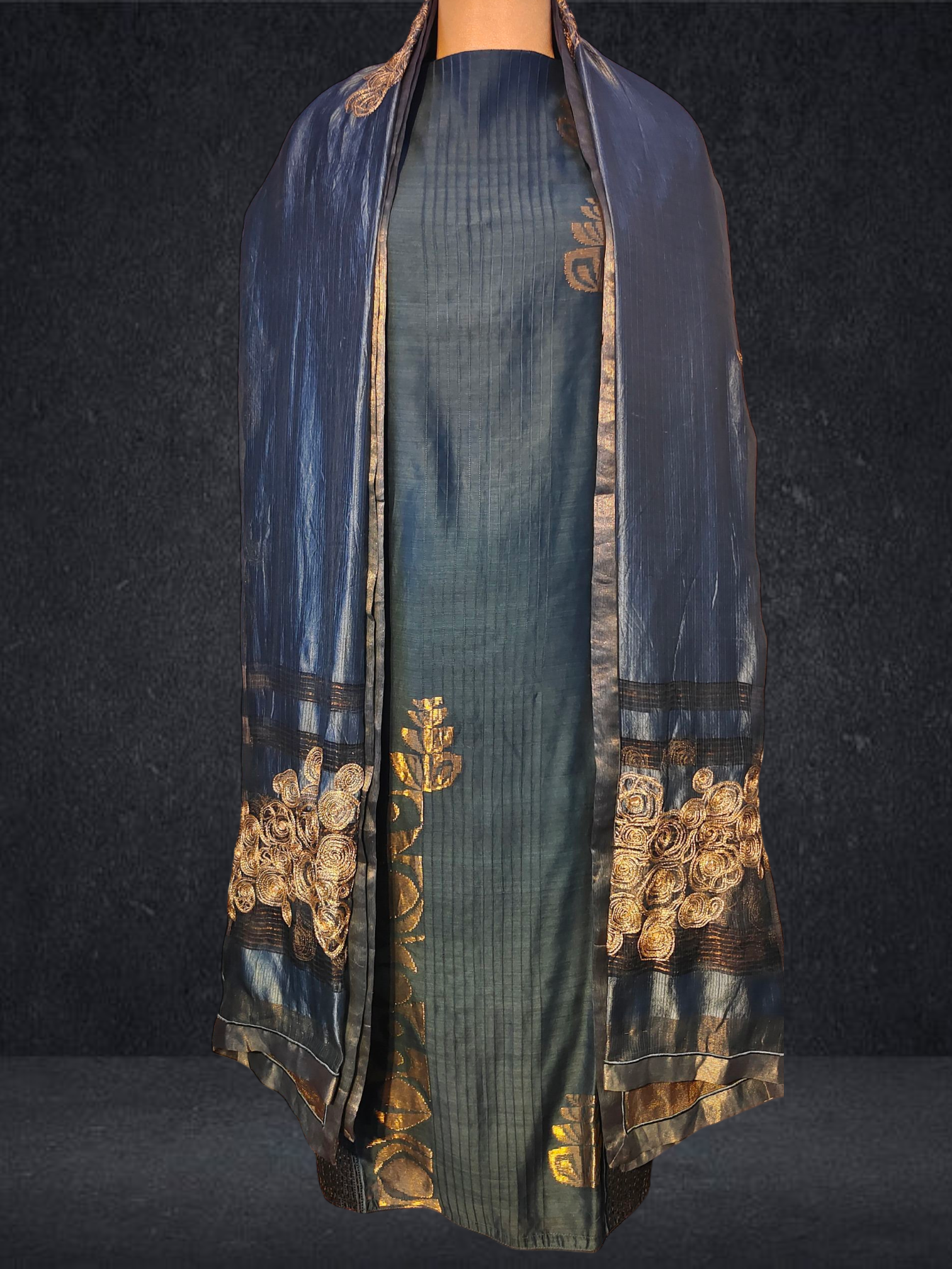 It is paired with a shaded Chanderi dupatta with floral motifs. The dupatta measures 2.5 meters in length and 38 inches in width.The ensemble is provided with a matching cotton satin bottom material for 2.5 mts.