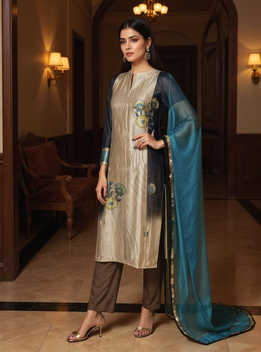 This 3 pc suitset features an elegant zari woven buta kurta and textured chanderi designed in unique abstract floral theme.Kurta is 48 inch maximum in length but can be shortened as per requirement as there is no neckline .The single side ghera is 34 inch so sizes upto 5XL are possible to get tailored in this material.The kurta is prelined with cotton mal.
