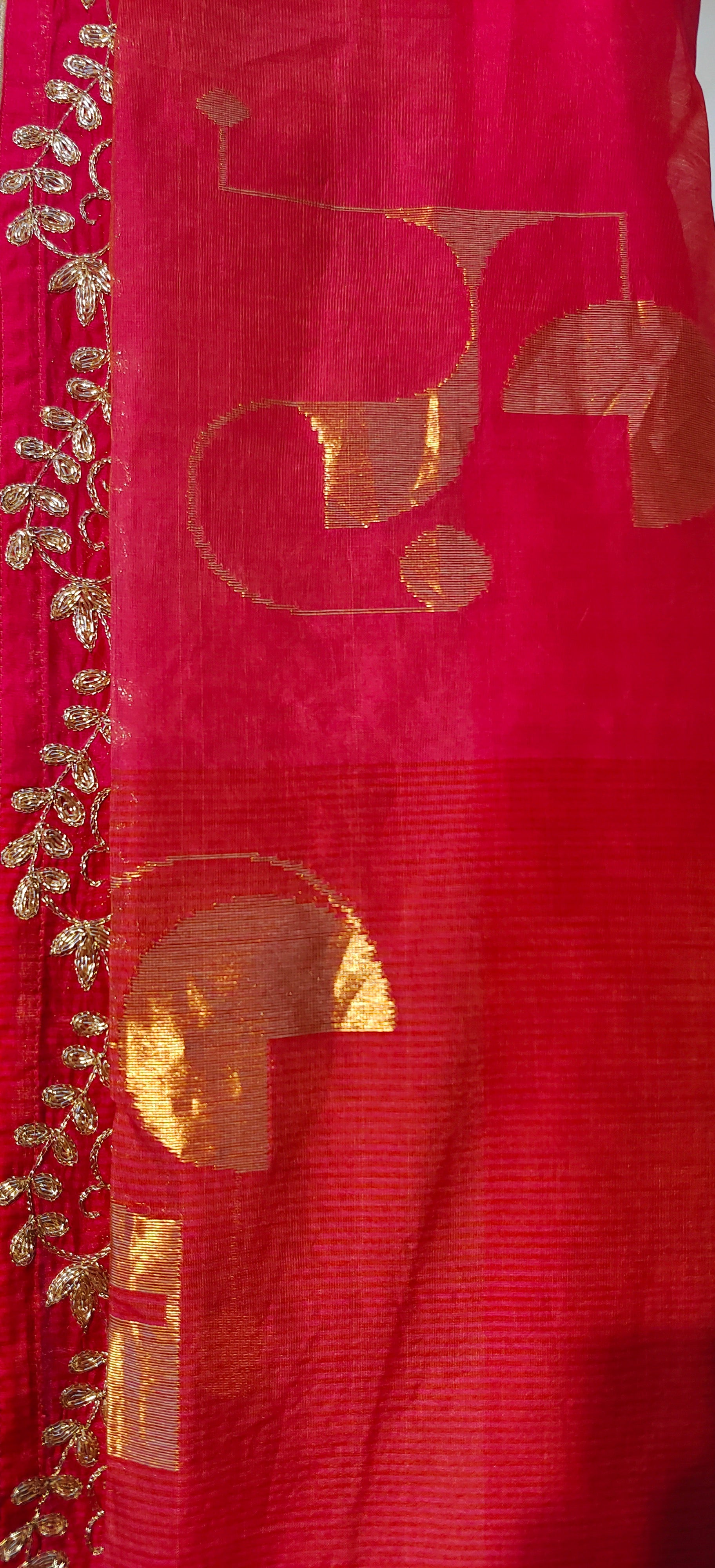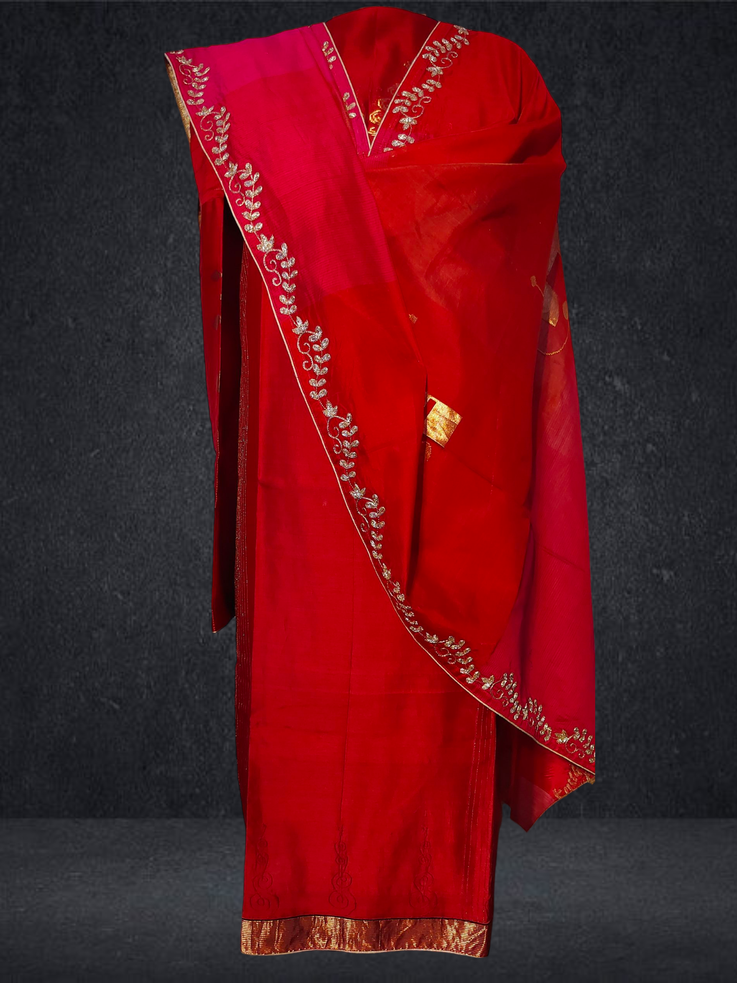 It is paired with a shaded Chanderi dupatta with floral motifs. The dupatta measures 2.5 meters in length and 38 inches in width.The ensemble is provided with a matching cotton satin bottom material for 2.5 mts.