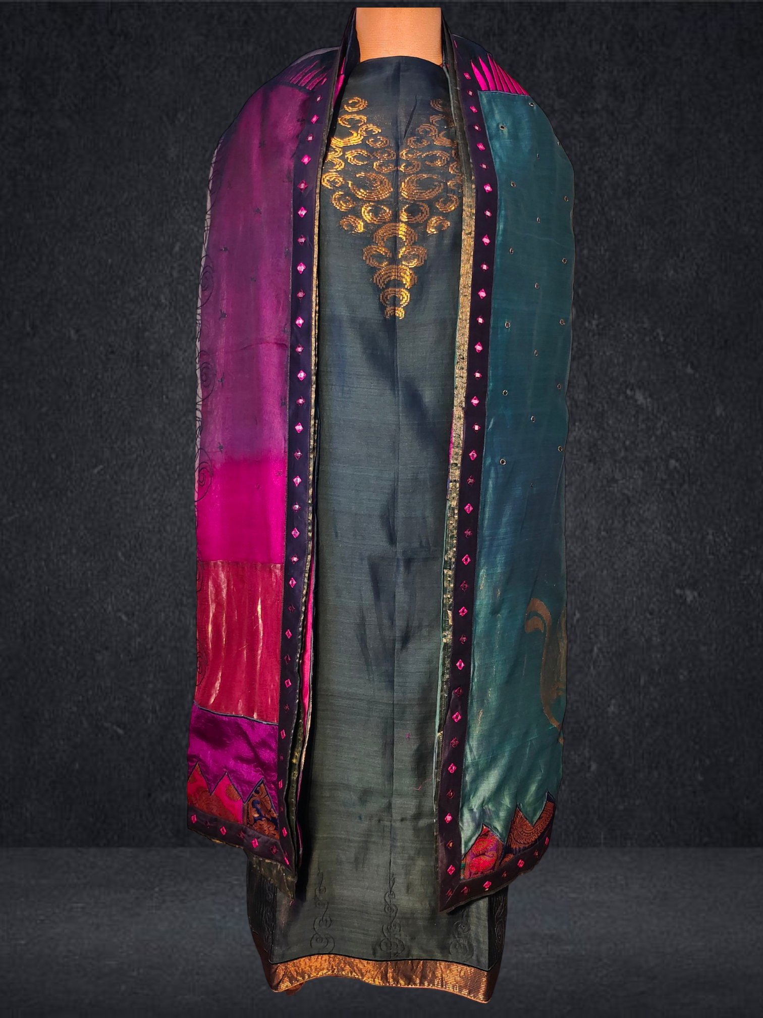 It is paired with a shaded Chanderi dupatta with floral motifs. The dupatta measures 2.5 meters in length and 38 inches in width.The ensemble is provided with a matching cotton satin bottom material for 2.5 mts.