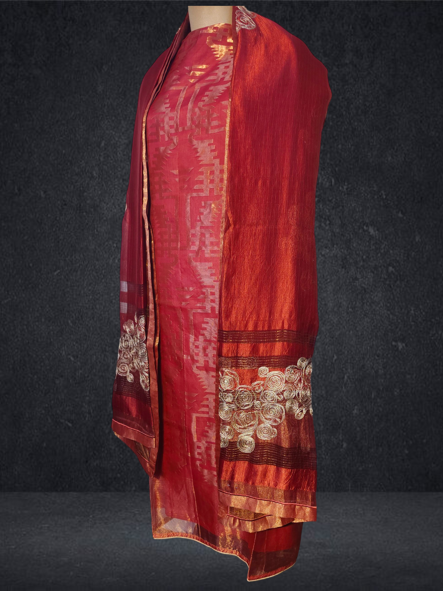 This 3 pc suitset features an elegant zari woven buta kurta and textured chanderi designed in unique abstract floral theme.Kurta is 48 inch maximum in length but can be shortened as per requirement as there is no neckline .The single side ghera is 34 inch so sizes upto 5XL are possible to get tailored in this material.The kurta is prelined with cotton mal.
