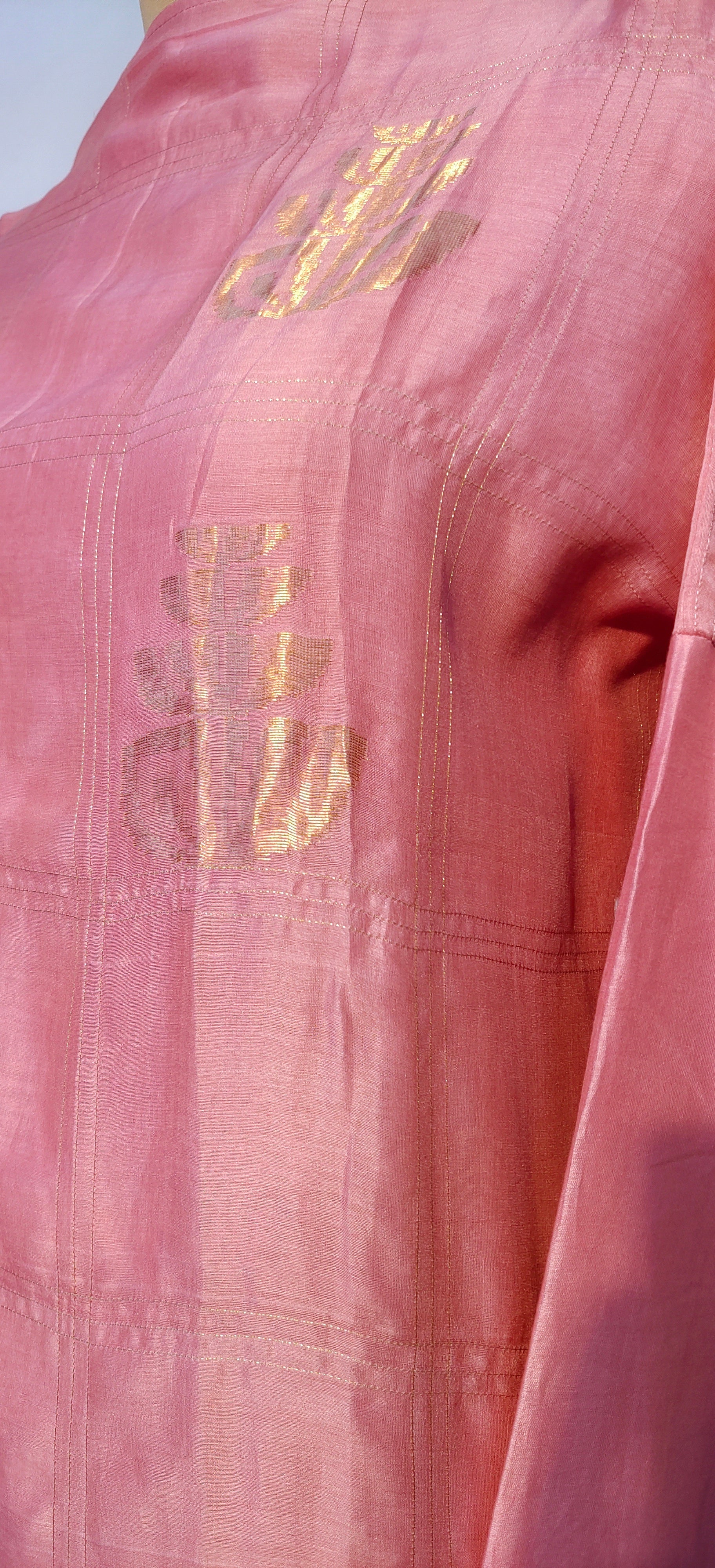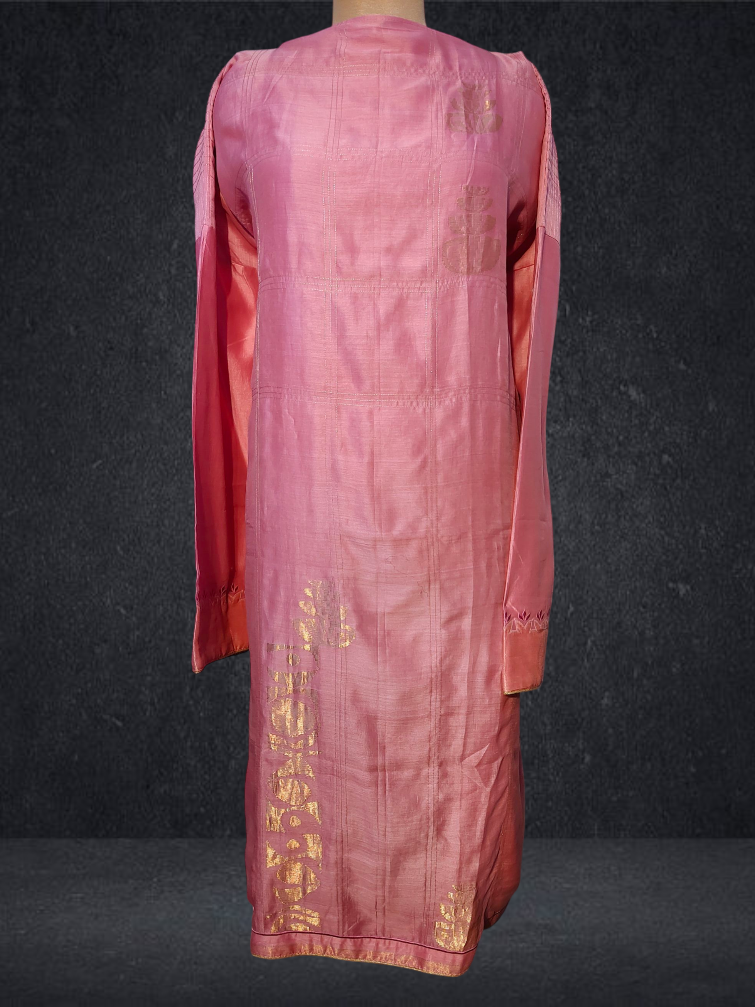 This 3 pc suitset features an elegant zari woven buta kurta and textured chanderi designed in unique abstract floral theme.Kurta is 48 inch maximum in length but can be shortened as per requirement as there is no neckline .The single side ghera is 34 inch so sizes upto 5XL are possible to get tailored in this material.The kurta is prelined with cotton mal.