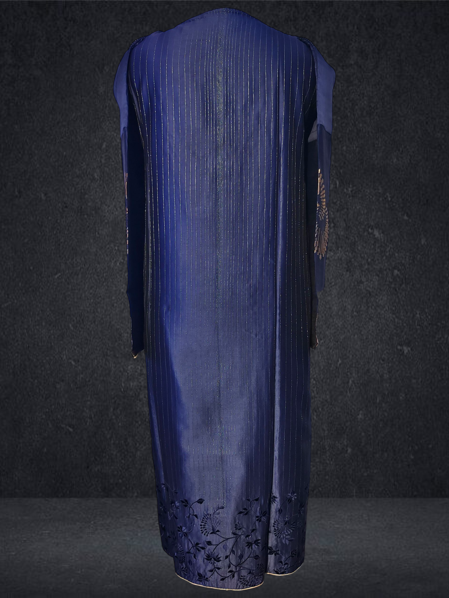 It is paired with a shaded Chanderi dupatta with floral motifs. The dupatta measures 2.5 meters in length and 38 inches in width.The ensemble is provided with a matching cotton satin bottom material for 2.5 mts.