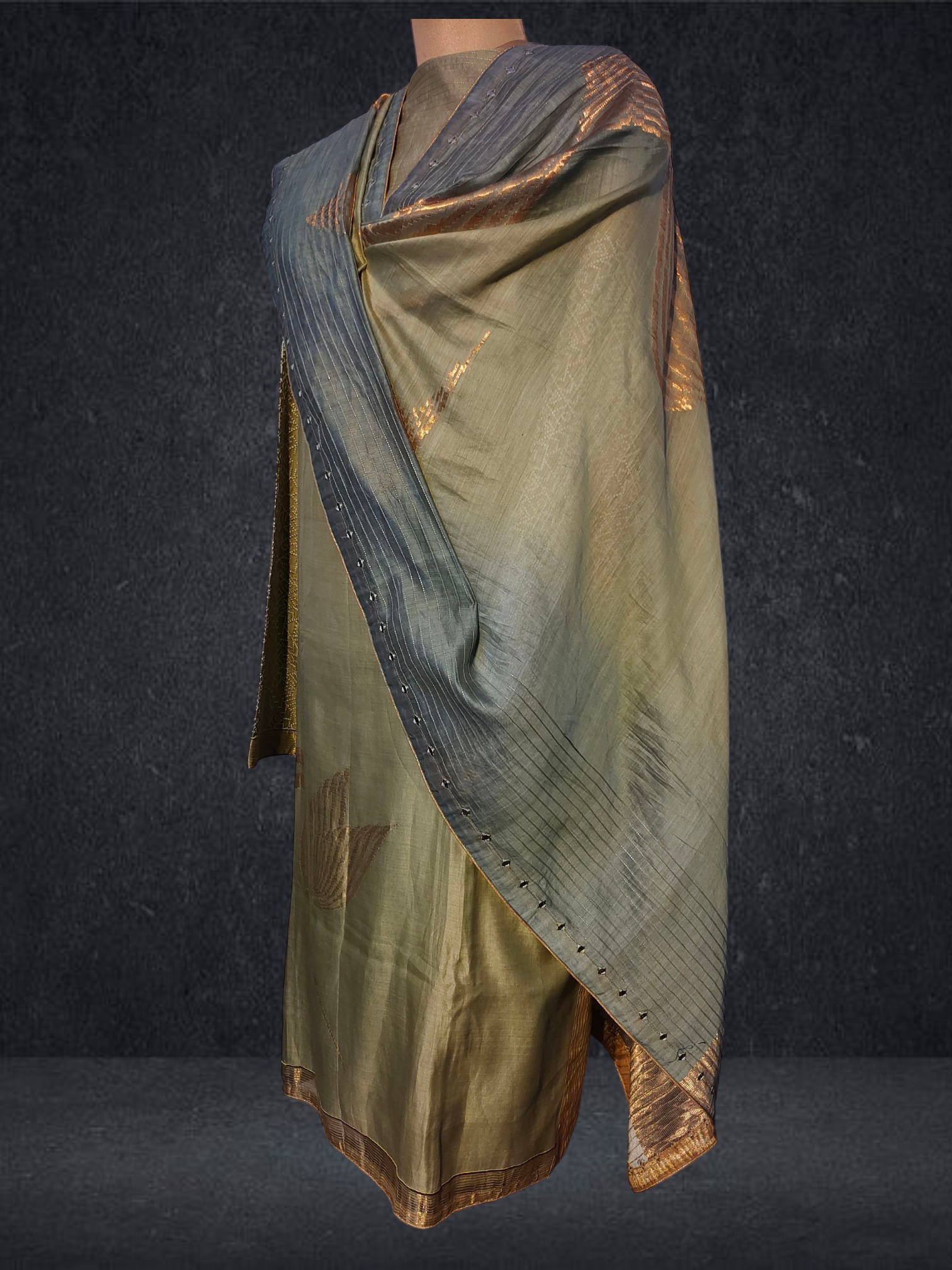 This 3 pc suitset features an elegant zari woven buta kurta and textured chanderi designed in unique abstract floral theme.Kurta is 48 inch maximum in length but can be shortened as per requirement as there is no neckline .The single side ghera is 34 inch so sizes upto 5XL are possible to get tailored in this material.The kurta is prelined with cotton mal.