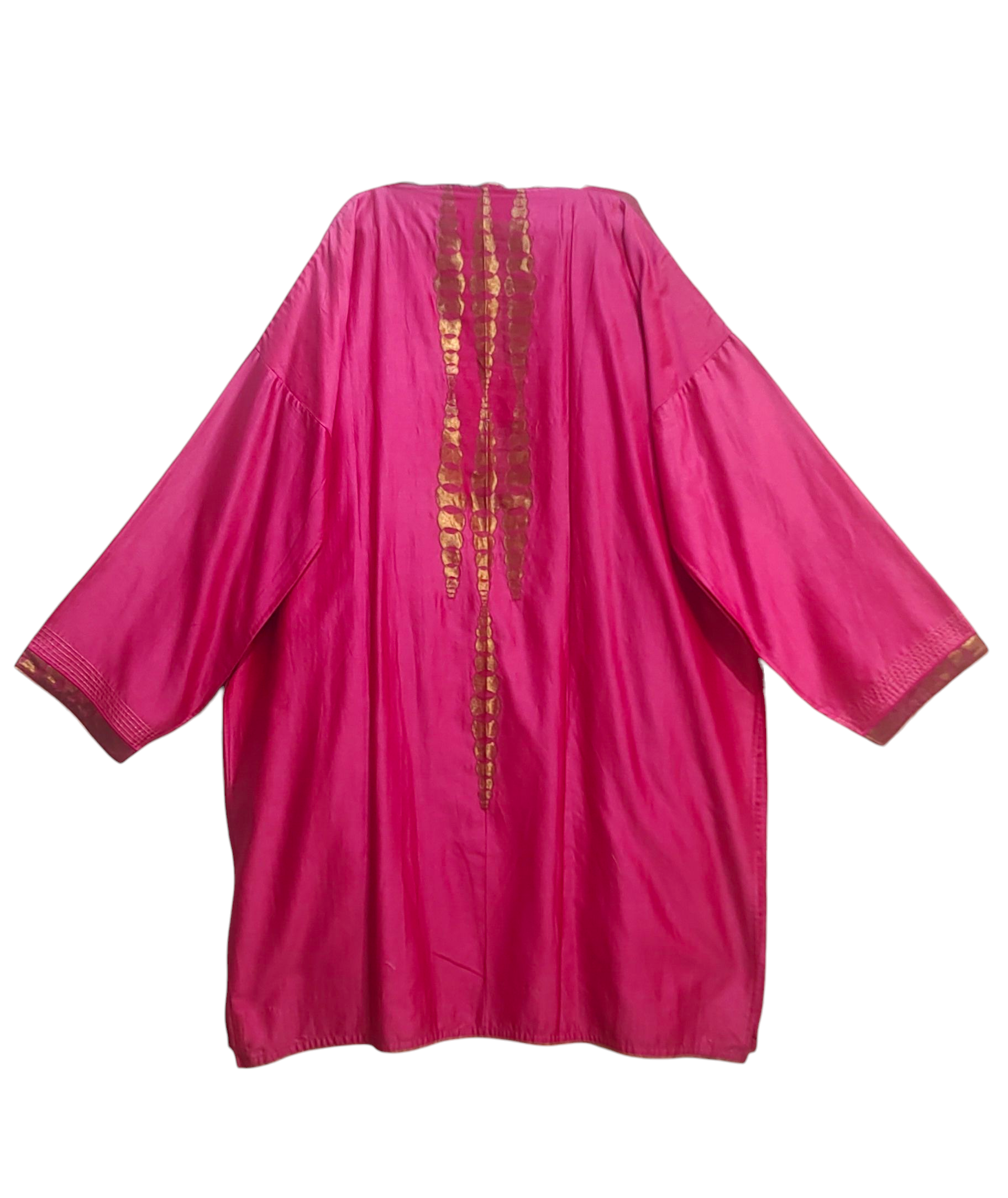 This semistitched 3 pc set features a calf mid-length bright fuchsia pink silk kurta with vertical pintuck detailing and golden block-printed vertical motifs, paired with a sheer dual-toned dupatta in olive green and pink ombré, featuring delicate golden embroidery and borders worn with matching solid colour satin trouser pants, silver oxidised jewellery in earrings and bangles, golden matching heel sandles