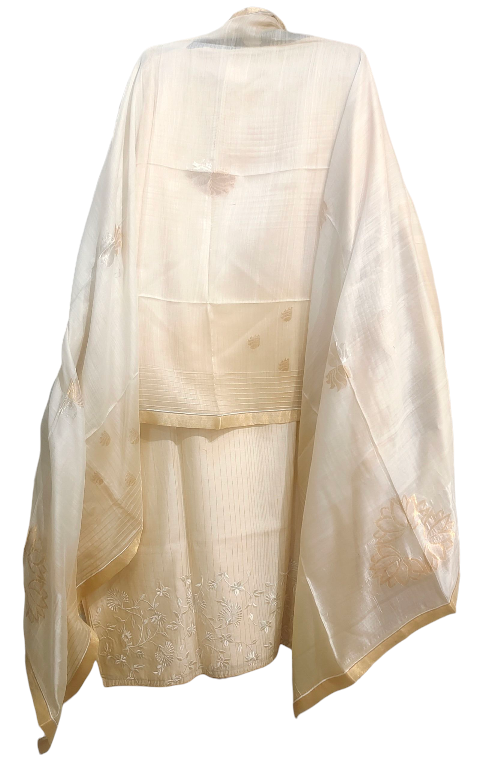 This semistitched 3 pc set features a mid calf-length ivory-beige silk kurta with delicate tonal floral embroidery on the sleeves and hem, and subtle golden threadwork on the neckline, paired with a sheer matching dupatta featuring light golden embroidered motifs and a soft zari border,worn with matching solid colour satin trouser pants, silver oxidised jewellery in earrings and bangles, golden matching heel sandles