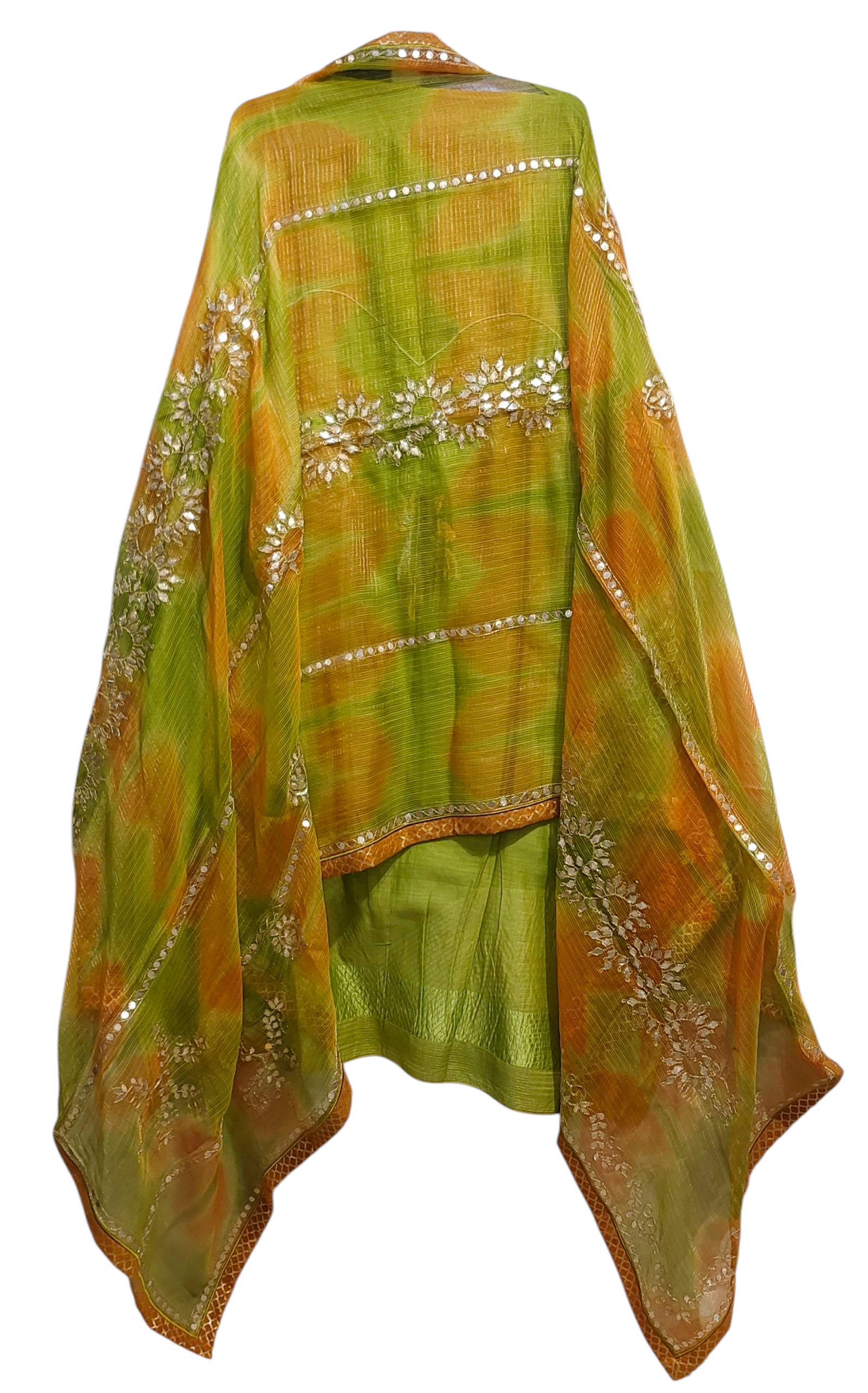 This semistitched 3 pc set features a light green chanderi silk kurta with subtle gold floral buti embroidery and a relaxed straight cut with long sleeves, paired with a sheer green and saffron tie-dye organza dupatta featuring silver floral zari work and orange-gold embroidered border worn with matching solid colour satin trouser pants, silver oxidised jewellery in earrings and bangles, golden matching heel sandles