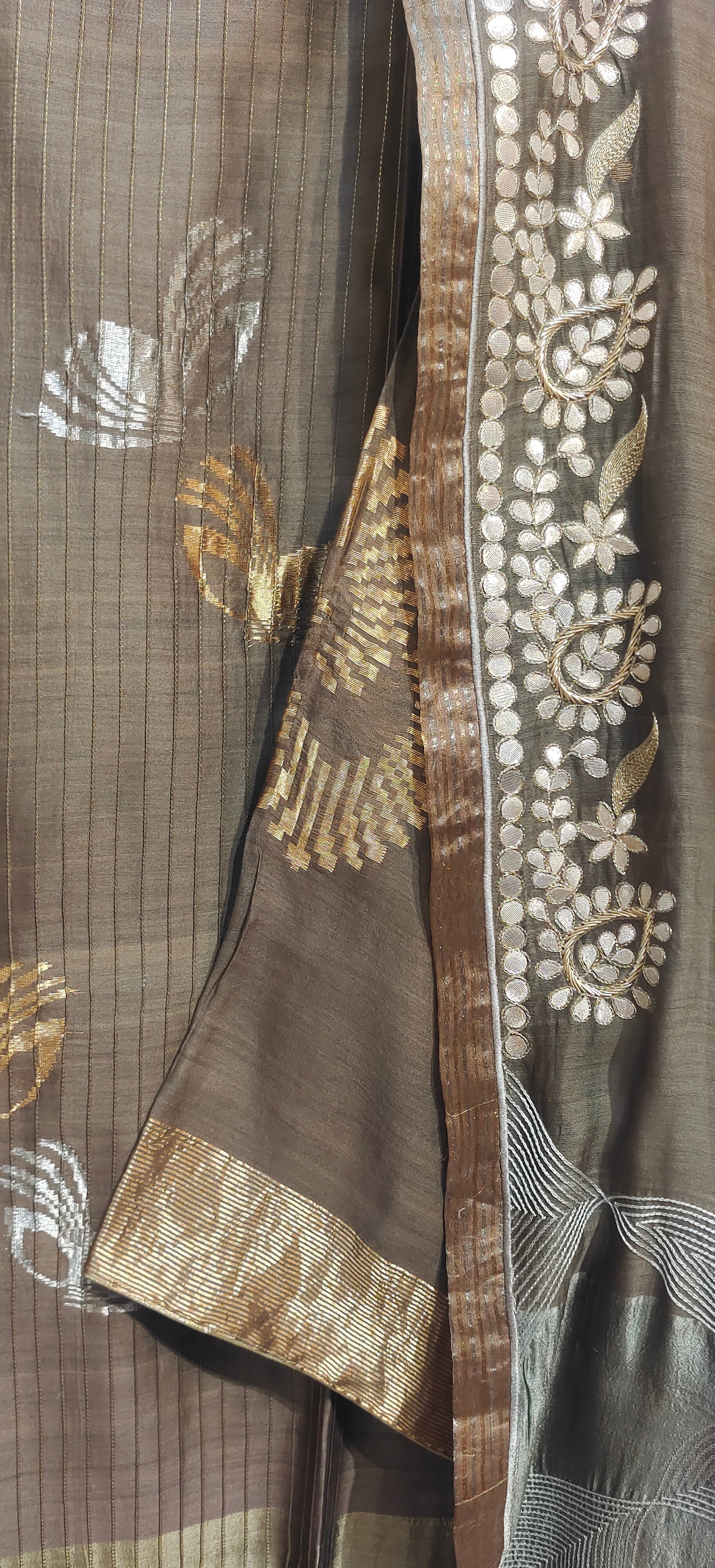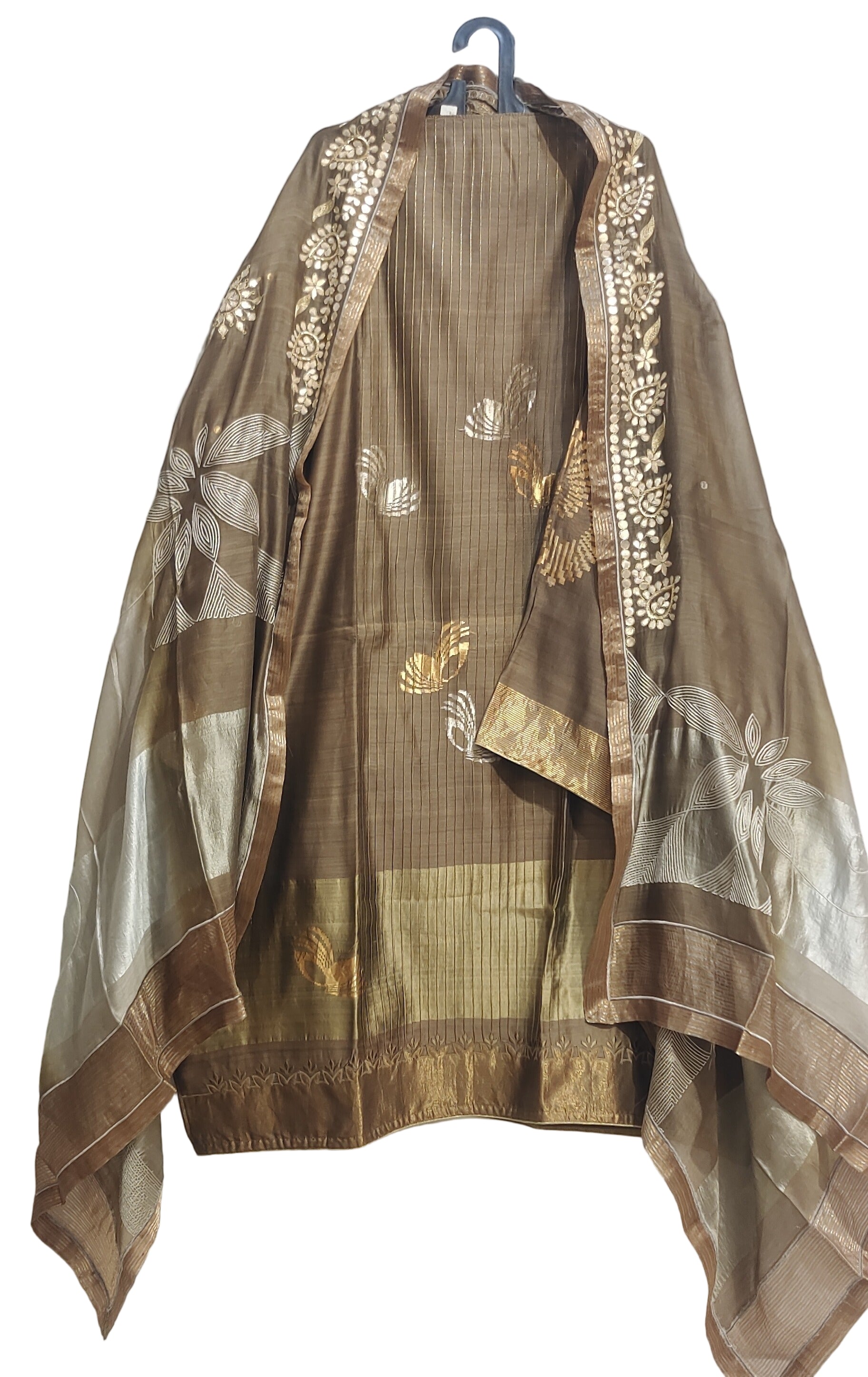 This semistitched 3 pc set features a mid calf length khaki silk kurta with clustered gold floral embroidery along the hem and upper bodice, paired with a sheer ombré peach-to-rose silk dupatta featuring delicate woven floral motifs and soft gold borders, worn with matching solid colour satin trouser pants, silver oxidised jewellery in earrings and bangles, golden matching heel sandles