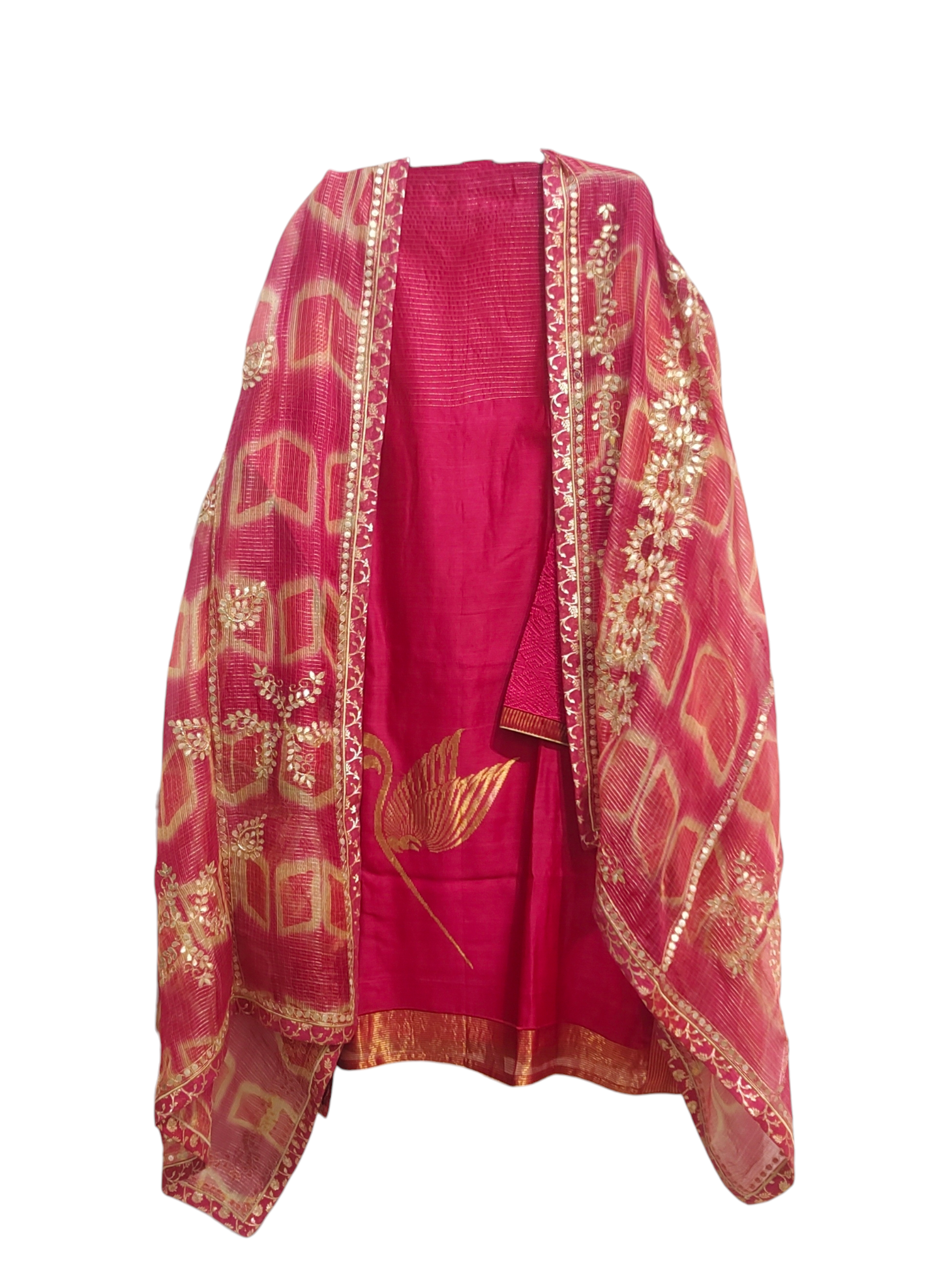 This semistitched 3 pc set features a mid calf length rani pink chanderi silk zari woven kurta adorning a woven flamingo motif, styled with a dramatic shaded shibori dupatta with gota embroidery motifs, worn with matching solid colour satin trouser pants