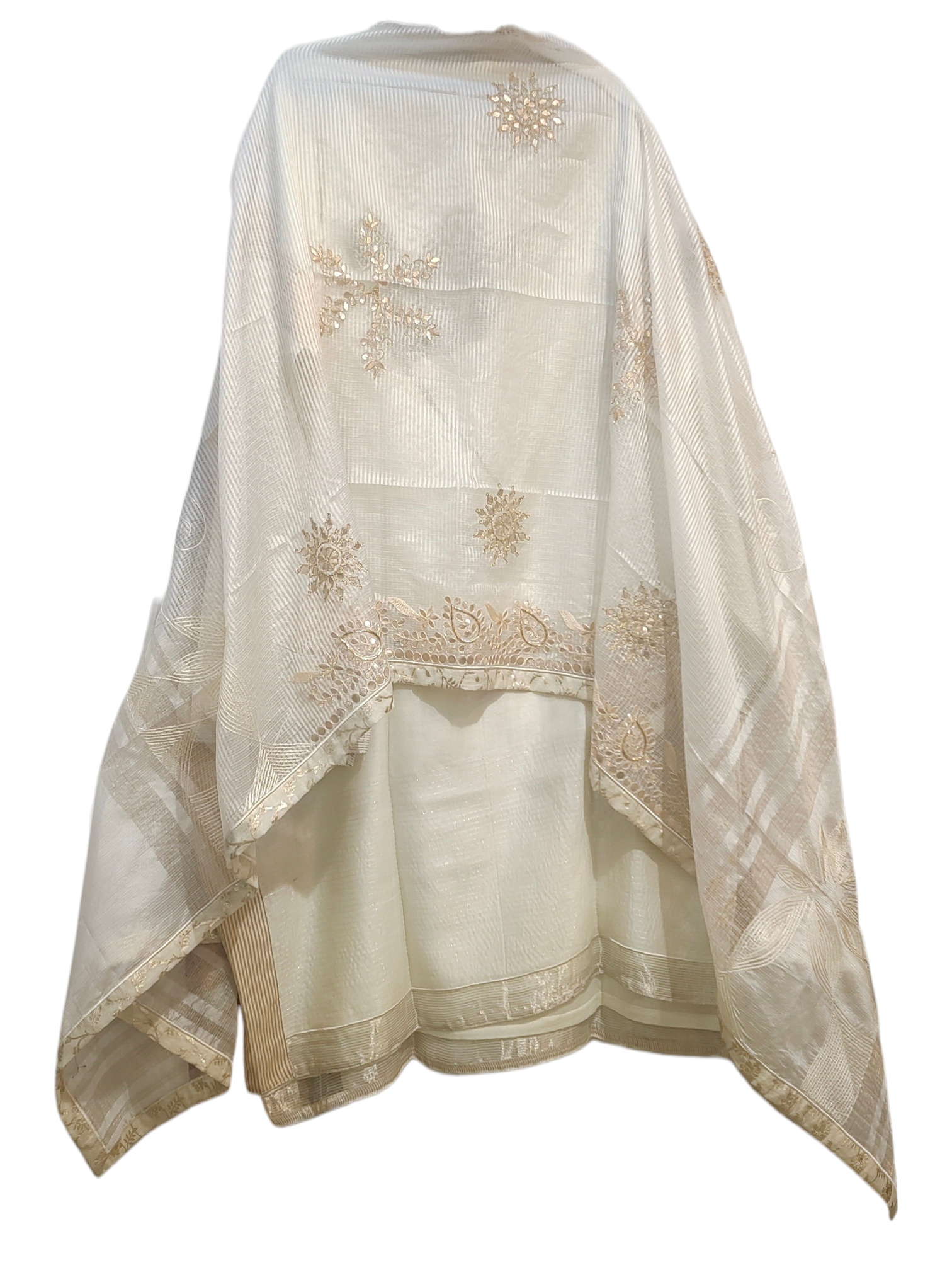 This semistitched 3 pc set features a mid calf length off white chanderi silk zari woven kurta with metallic silver flamingo bird motif, styled with a dramatic silk dupatta with hand embroidered gota zardozi floral design layout with borders and ari work, worn with matching solid colour satin trouser pants