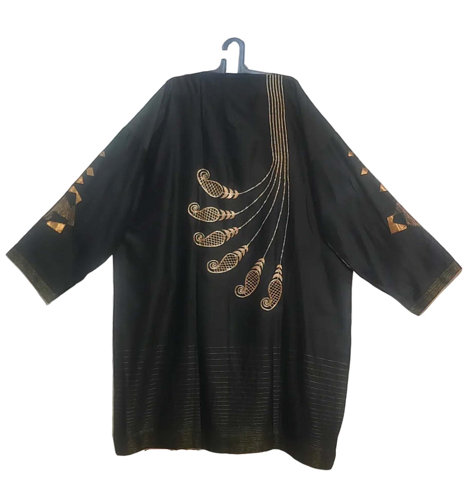 This semistitched 3 pc set features a knee-length straight-cut black kurta with intricate beige paisley embroidery fanning out from one side, paired with solid black tapered pants and a sheer black-to-beige gradient dupatta featuring subtle floral motifs and gold border detailing. The dupatta measures 2.5 meters in length and 38 inches in width.The ensemble is provided with a matching cotton satin bottom material for 2.5 mts.