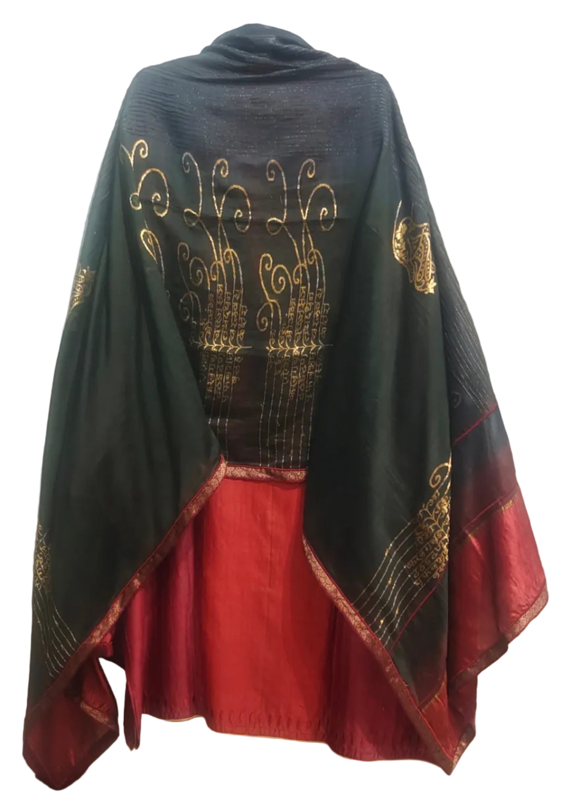 This semistitched 3 pc set features a knee-length straight-cut deep maroon silk kurta with intricate gold floral embroidery at the front, paired with matching tapered pants and a sheer black dupatta featuring ornate gold threadwork and a maroon border, styled in a poised minimal fashion editorial pose. The dupatta measures 2.5 meters in length and 38 inches in width.The ensemble is provided with a matching cotton satin bottom material for 2.5 mts.