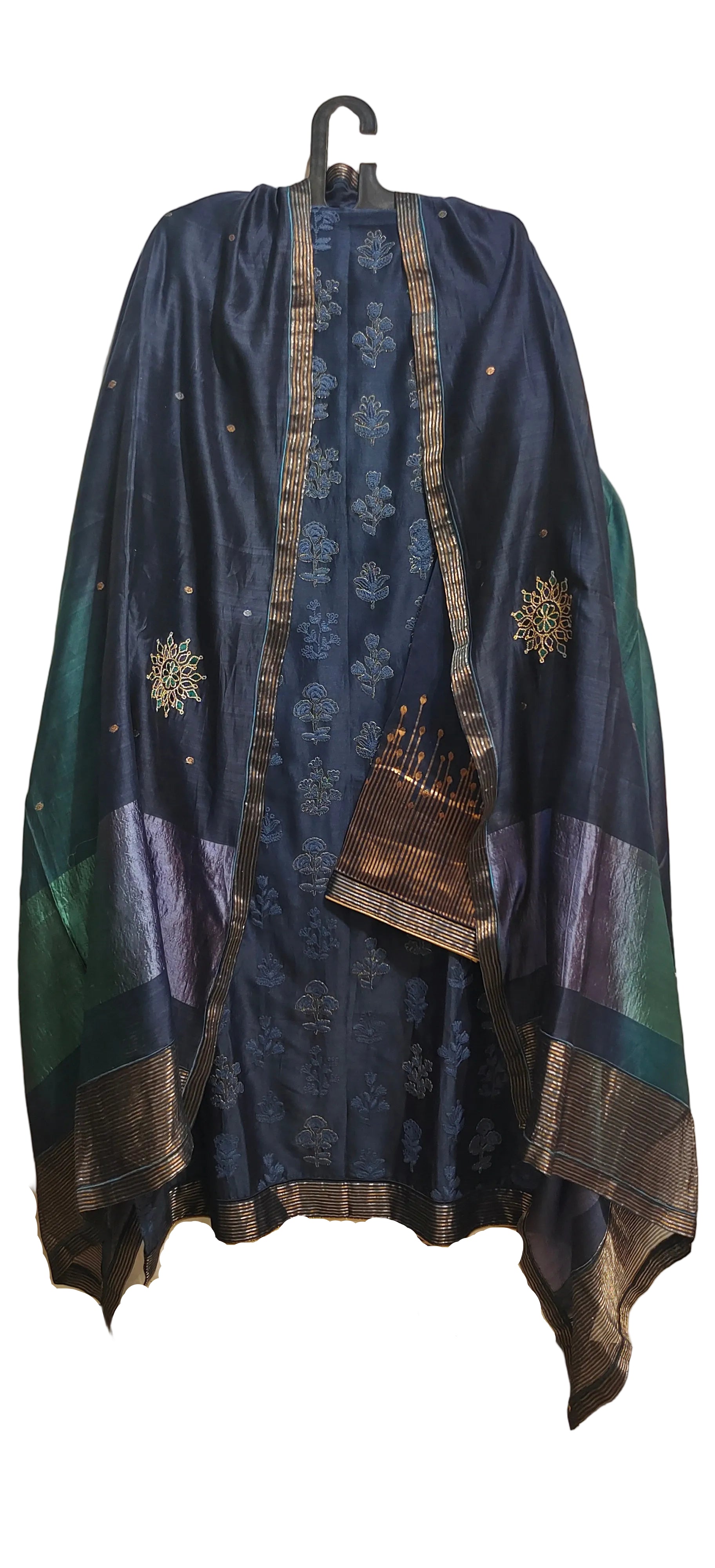 This semistitched 3 pc set features a knee-length navy blue silk kurta with all-over tonal floral embroidery and metallic thread border, paired with slim navy trousers and a teal to navy ombré dupatta featuring gold motifs, zari border, and subtle shimmer,