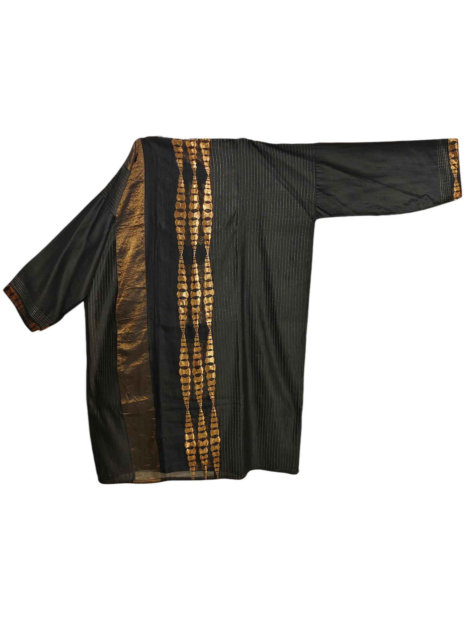 A wearing black silk mid-length kurta with subtle vertical pinstripes and bold gold foil vertical motifs, paired with a sheer ombré black-to-beige dupatta featuring gold embroidered sunburst motifs and metallic borders, clean minimal fashion product photo, styled in the dramatic richness of an Indian high-fashion editorial, poised and elegant stance