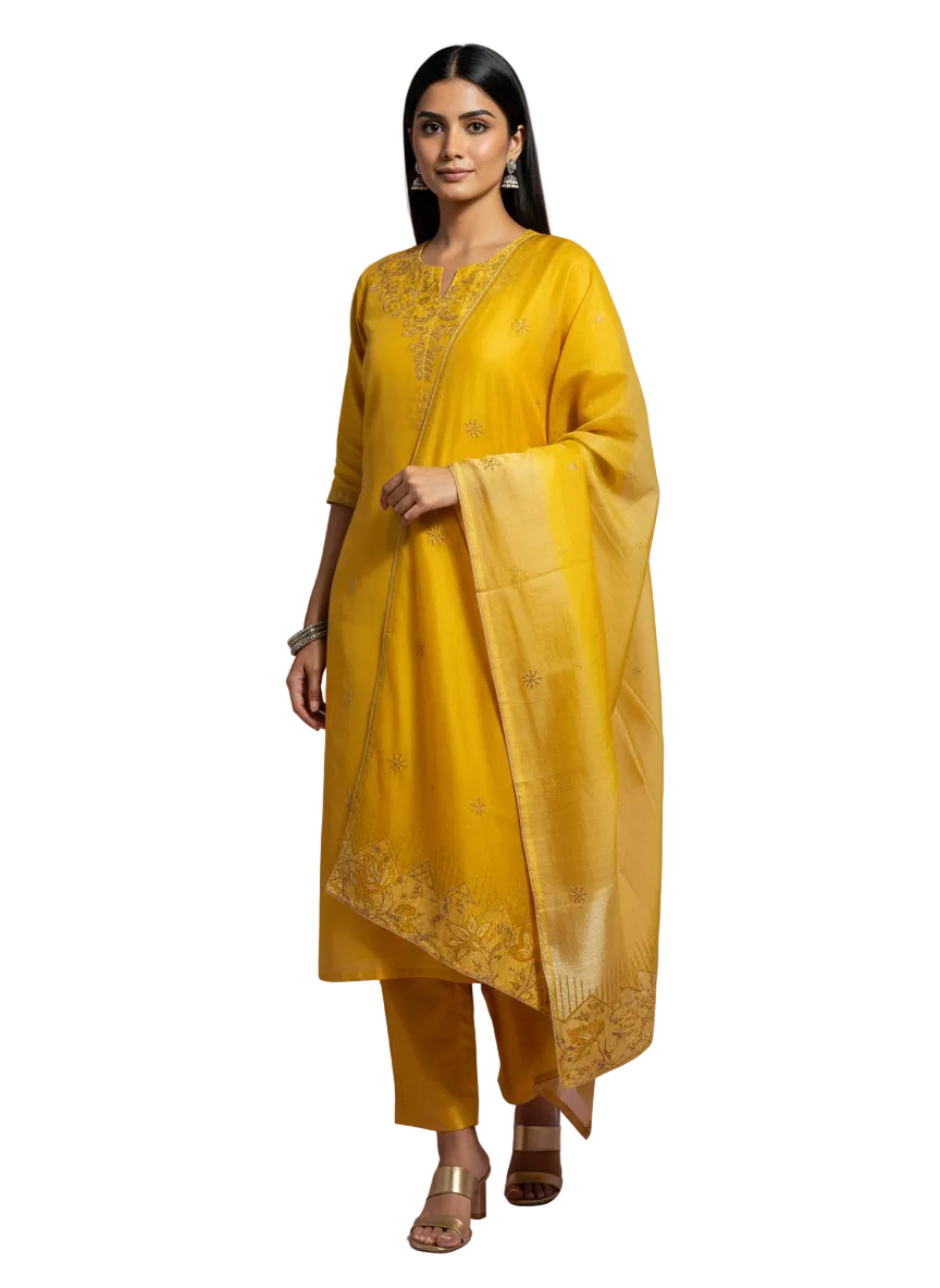A wearing vibrant yellow silk mid-length kurta with subtle floral embroidery on the neckline and elbow-length sleeves, paired with a sheer yellow dupatta featuring delicate embroidered starburst motifs and intricately woven floral zari borders in gold and green, clean minimal fashion product photo, styled in the radiant elegance of a traditional Indian summer fashion editorial, luminous and poised stance