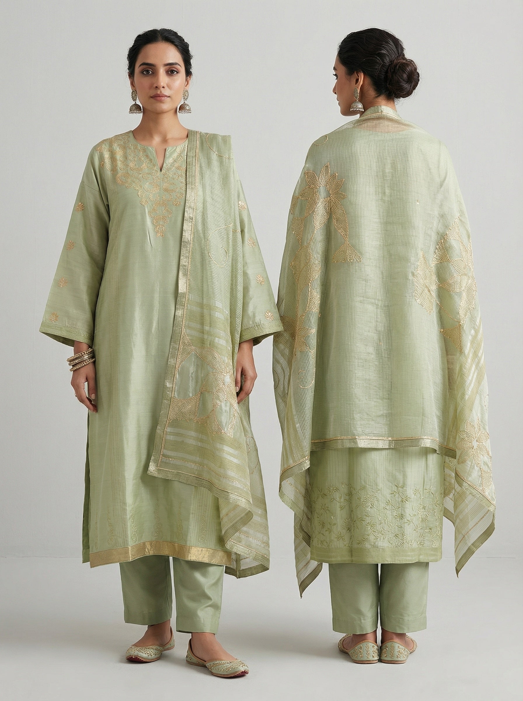A long pastel sage green kurta with delicate gold embroidery on the chest, sleeves, and lower hem, featuring a straight loose fit and wide sleeves, paired with a sheer dupatta in matching sage green with golden striped borders and large floral threadwork embroidery