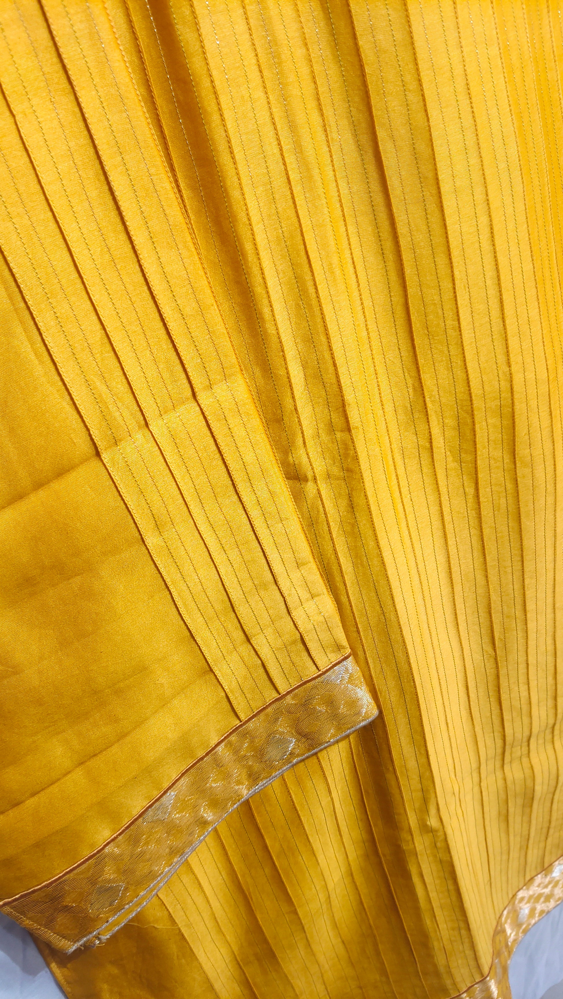A long mustard yellow kurta with subtle vertical stripe texture and gold brocade accents on the hem and cuffs, styled with a sheer dupatta in a vibrant ombré gradient from yellow to deep red, featuring delicate gold floral embroidery and shimmering thread detailing, finished with a bold red border