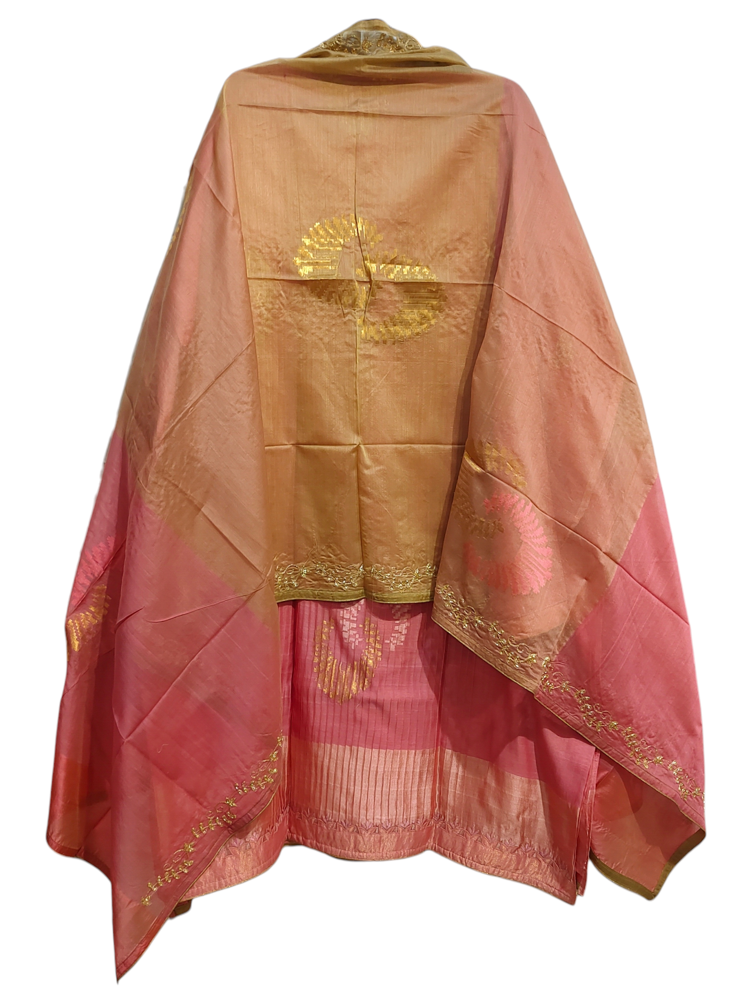 The dupatta measures 2.5 meters in length and 38 inches in width.The ensemble is provided with a matching cotton satin bottom material for 2.5 mts.