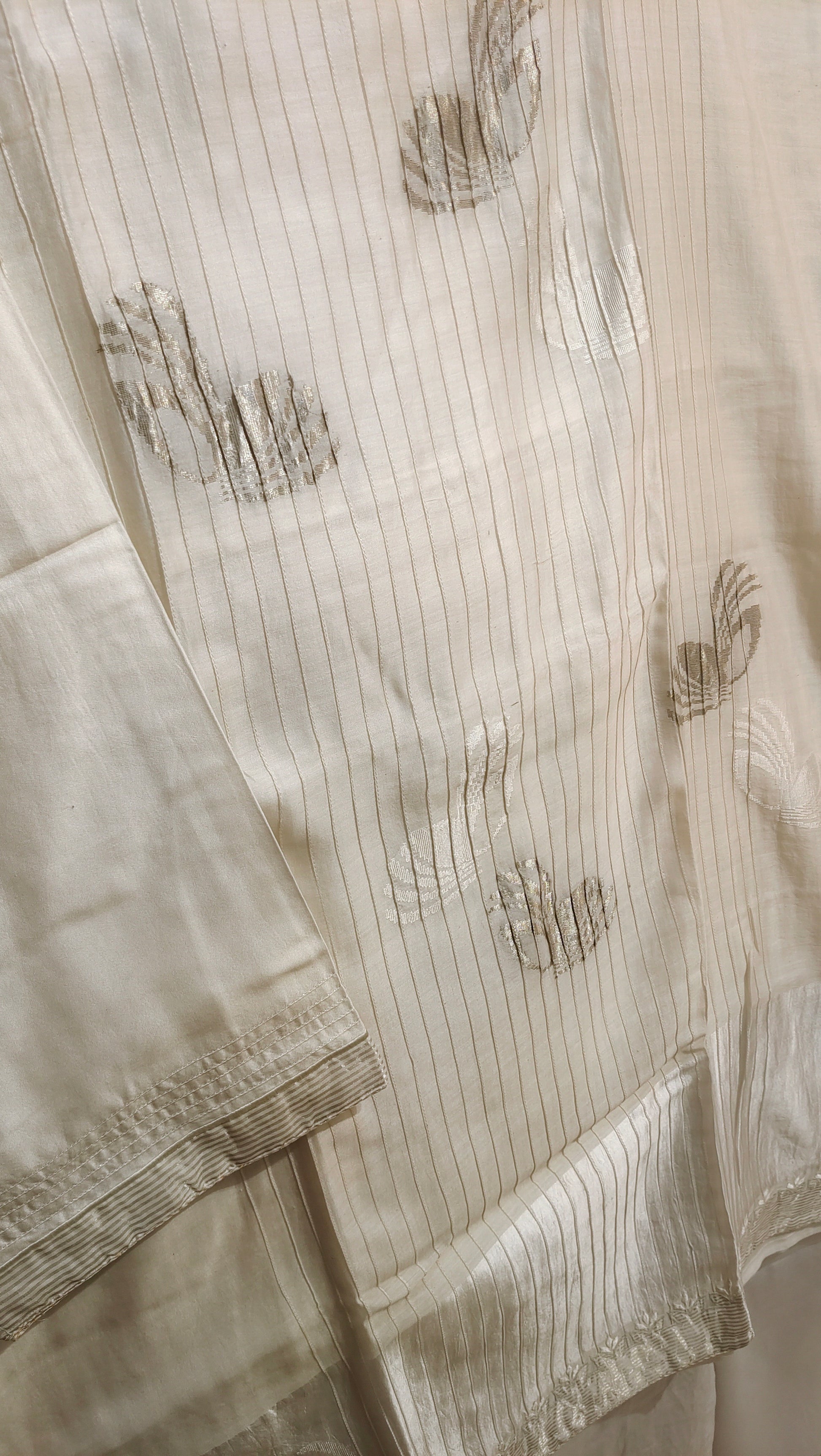 A traditional long ivory silk kurta with silver zari woven butterfly inspired abstract motifs, styled with a sheer organza dupatta featuring vibrant pink, yellow, and peach petal appliqué in radial and linear patterns, and finished with a coral pink brocade border;