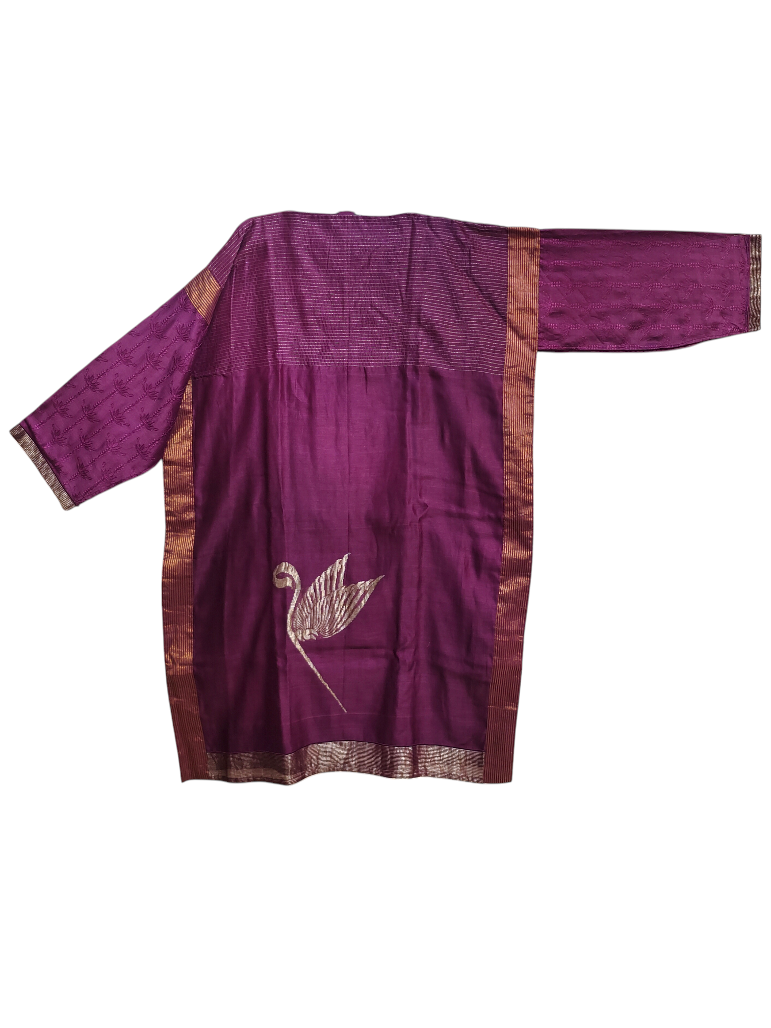A long deep plum silk kurta with metallic silver bird embroidery and textured sleeves, styled with a sheer organza dupatta in rich wine tones featuring bold magenta floral embroidery and striped jacquard accents, finished with metallic borders.