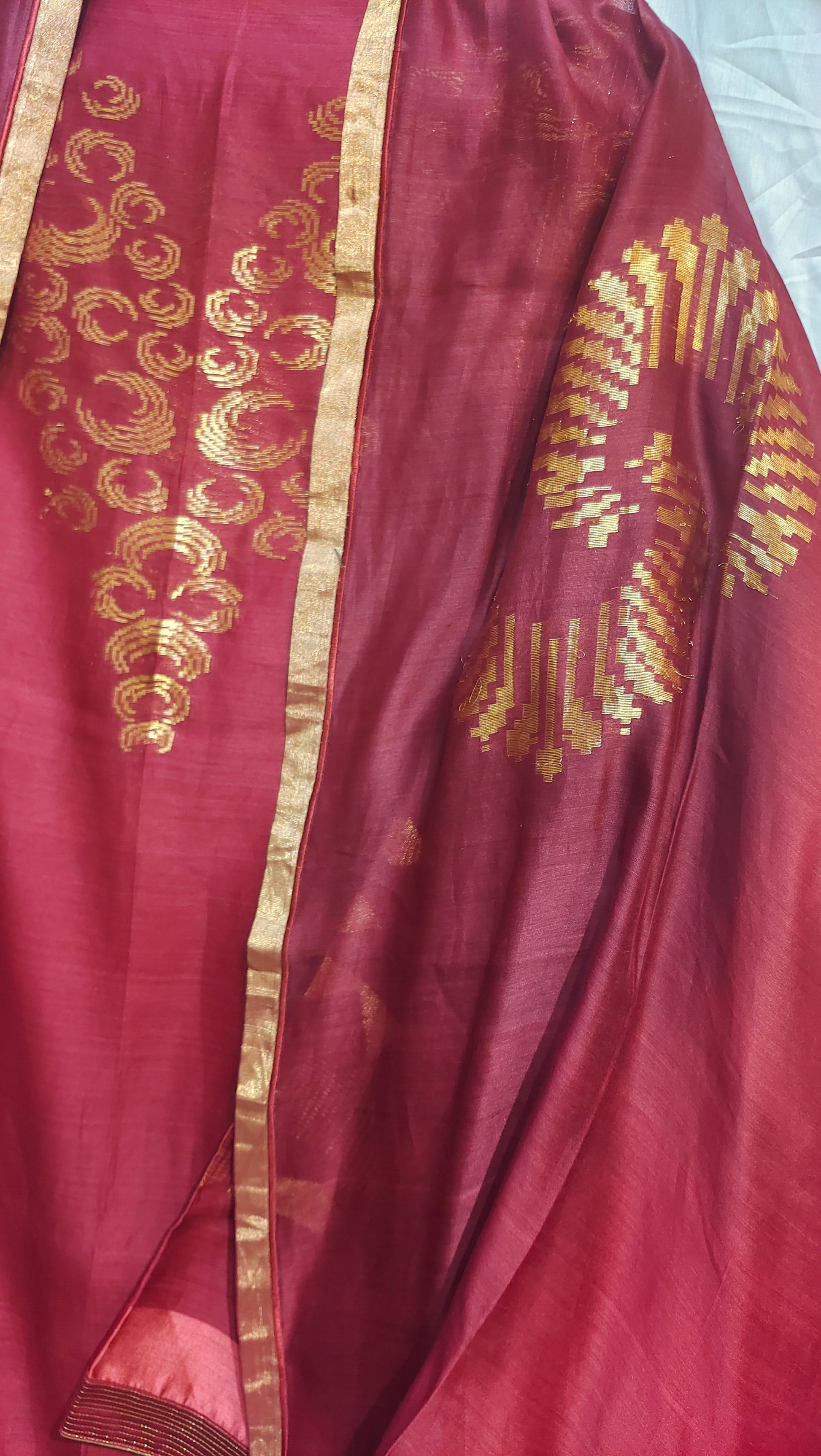 A deep maroon silk kurta set with intricate golden zari embroidery in a regal V-shape across the chest and fine pintuck detailing along the front. The ensemble is paired with a flowing dupatta in matching maroon, adorned with bold circular golden motifs radiating like sunbursts and framed with a traditional zari border. The rich jewel tone and heritage craftsmanship evoke a timeless elegance, styled minimally for a luxurious festive or wedding-ready look.